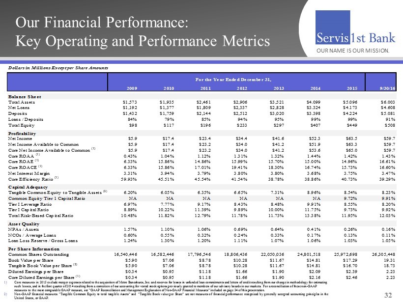 Our Financial Performance: Key Operating and Performance Metrics 32 OUR NAME IS OUR MISSION . Dollars in Millions Except per Share Amounts 2009 2010 2011 2012 2013 2014 2015 9/30/16 Balance Sheet Total Assets $1,573 $1,935 $2,461 $2,906 $3,521 $4.099 $5.096 $6.003 Net Loans $1,192 $1,377 $1,809 $2,337 $2,828 $3.324 $4.173 $4.608 Deposits $1,432 $1,759 $2,144 $2,512 $3,020 $3.398 $4.224 $5.081 Loans / Deposits 84% 79% 85% 94% 95% 99% 99% 91% Total Equity $98 $117 $196 $233 $297 $407 $449 $508 Profitability Net Income $5.9 $17.4 $23.4 $34.4 $41.6 $52.3 $63.5 $59.7 Net Income Available to Common $5.9 $17.4 $23.2 $34.0 $41.2 $51.9 $63.3 $59.7 Core Net Income Available to Common (1) $5.9 $17.4 $23.2 $34.0 $41.2 $53.6 $65.0 $59.7 Core ROAA (1) 0.43% 1.04% 1.12% 1.31% 1.32% 1.44% 1.42% 1.43% Core ROAE (1) 6.33% 15.86% 14.86% 15.99% 15.70% 15.00% 14.96% 16.61% Core ROACE (1) 6.33% 15.86% 17.01% 19.41% 18.30% 16.74% 15.73% 16.60% Net Interest Margin 3.31% 3.94% 3.79% 3.80% 3.80% 3.68% 3.75% 3.47% Core Efficiency Ratio (1) 59.93% 45.51% 45.54% 41.54% 38.78% 38.86% 40.73% 39.29% Capital Adequacy Tangible Common Equity to Tangible Assets (2) 6.20% 6.05% 6.35% 6.65% 7.31% 8.96% 8.54% 8.23% Common Equity Tier 1 Capital Ratio NA NA NA NA NA NA 9.72% 9.91% Tier I Leverage Ratio 6.97% 7.77% 9.17% 8.43% 8.48% 9.91% 8.55% 8.20% Tier I Capital Ratio 8.89% 10.22% 11.39% 9.89% 10.00% 11.75% 9.73% 9.92% Total Risk-Based Capital Ratio 10.48% 11.82% 12.79% 11.78% 11.73% 13.38% 11.95% 12.03% Asset Quality NPAs / Assets 1.57% 1.10% 1.06% 0.69% 0.64% 0.41% 0.26% 0.16% NCOs / Average Loans 0.60% 0.55% 0.32% 0.24% 0.33% 0.17% 0.13% 0.11% Loan Loss Reserve / Gross Loans 1.24% 1.30% 1.20% 1.11% 1.07% 1.06% 1.03% 1.05% Per Share Information Common Shares Outstanding 16,540,446 16,582,446 17,796,546 18,806,436 22,050,036 24,801,518 25,972,698 26,305,448 Book Value per Share $5.90 $7.06 $8.78 $10.28 $11.67 $14.81 $17.29 19.31 Tangible Book Value per Share (2) $5.90 $7.06 $8.78 $10.28 $11.67 $14.81 $16.70 18.73 Diluted Earnings per Share $0.34 $0.95 $1.18 $1.66 $1.90 $2.09 $2.39 2.23 Core Diluted Earnings per Share (1) $0.34 $0.95 $1.18 $1.66 $1.90 $2.16 $2.46 2.23 For the Year Ended December 31, 1) Core measures in 2015 exclude merger expenses related to the acquisition of Metro Bancshares, Inc. and reserves for losses in un funded loan commitments and letters of credit resulting from our change in methodology for estimating such losses, and in the first quarter of 2014 resulting from a correction of our accounting for vested stock options previous ly granted to members of our advisory boards in our markets. For a reconciliation of these non - GAAP measures to the most comparable GAAP measure, see "GAAP Reconciliation and Management Explanation of Non - GAAP Financial Measures " included on page 34 of this presentation. 2) Non - GAAP financial measures . "Tangible Common Equity to total tangible Assets" and "Tangible Book value per Share" are not measures of financial performance recognized by generally accepted accounting principles in the United States, or GAAP .