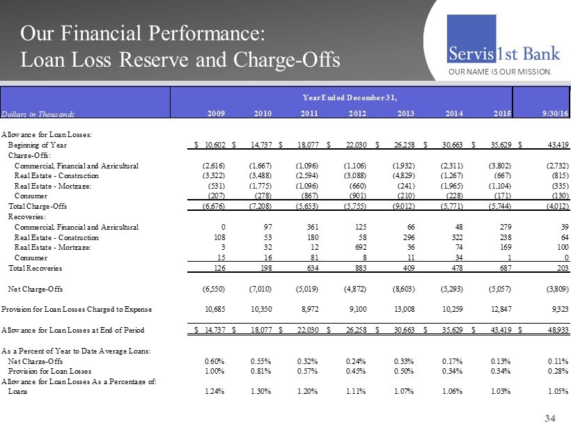 Our Financial Performance: Asset Quality 33 OUR NAME IS OUR MISSION. Dollars in Thousands 2009 2010 2011 2012 2013 2014 2015 9/30/16 Nonaccrual Loans: 1-4 Family 265 202 670 453 1,878 1,596 198 255 Owner-Occupied Commercial Real Estate 909 635 792 2,786 1,435 683 -- 1,439 Other Real Estate Loans 615 -- 693 240 243 959 1,619 408 Commercial, Financial & Agricultural 2,032 2,164 1,179 276 1,714 172 1,918 1,169 Construction 8,100 10,722 10,063 6,460 3,749 5,049 4,000 3,376 Consumer -- 624 375 135 602 666 31 -- Total Nonaccrual Loans 11,921 14,347 13,772 10,350 9,621 9,125 7,766 6,647 Total 90+ Days Past Due and Accruing 267 -- -- 8 115 925 1 43 Total Nonperforming Loans 12,188 14,347 13,772 10,358 9,736 10,050 7,767 6,690 Other Real Estate Owned and Repossessions 12,525 6,966 12,305 9,721 12,861 6,840 5,392 3,035 Total Nonperforming Assets 24,713 21,313 26,077 20,079 22,597 16,890 13,159 9,725 Troubled Debt Restructurings (Accruing): 1-4 Family -- -- -- 1,709 8,225 -- -- -- Owner-Occupied Commercial Real Estate 845 -- 2,785 3,121 -- -- -- -- Other Real Estate Loans -- -- 331 302 285 1,663 253 219 Commercial, Financial & Agricultural -- 2,398 1,369 1,168 962 6,632 6,618 6,519 Construction -- -- -- 3,213 217 -- -- -- Consumer -- -- -- -- -- -- -- -- Total Troubled Debt Restructurings (Accruing) 845 2,398 4,485 9,513 9,689 8,295 6,871 6,738 Total Nonperforming Assets & Troubled Debt Restructurings (Accruing) 25,558 23,711 30,562 29,592 32,286 25,185 20,030 16,463 Total Nonperforming Loans to Total Loans 1.01% 1.03% 0.75% 0.44% 0.34% 0.30% 0.18% 0.14% Total Nonperforming Assets to Total Assets 1.57% 1.10% 1.06% 0.69% 0.64% 0.41% 0.26% 0.16% Total Nonperforming Assets and Troubled Debt Restructurings (Accruing) to Total Assets 1.62% 1.23% 1.24% 1.02% 0.92% 0.61% 0.39% 0.27% Year Ended December 31,