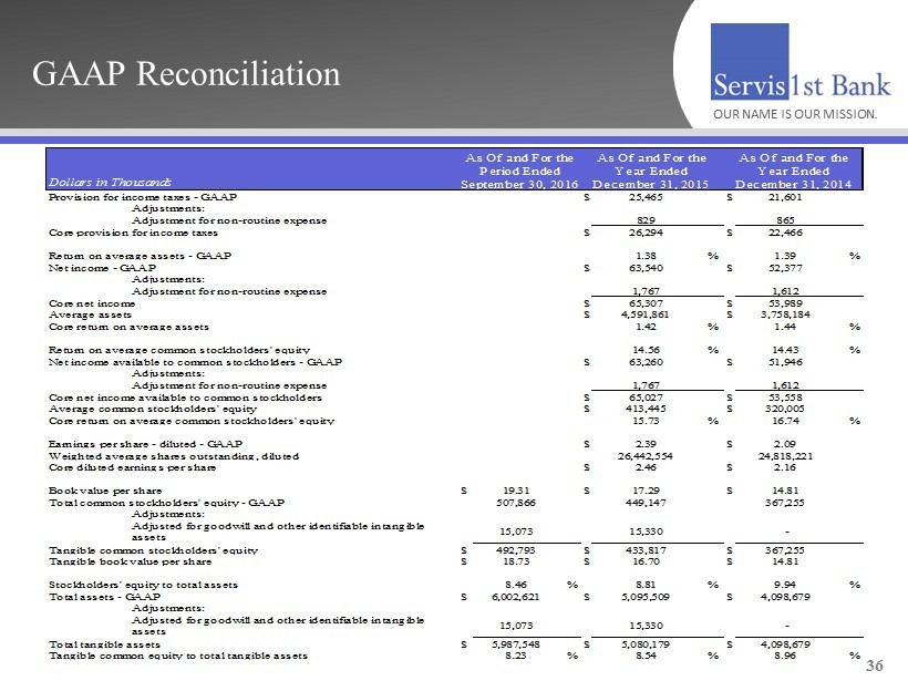 GAAP Reconciliation and Management Explanation of Non - GAAP Financial Measures 35 OUR NAME IS OUR MISSION . We recorded expenses of $2.1 million for the first quarter of 2015 related to the acquisition of Metro Bancshares, Inc. and t he merger of Metro Bank with and into the Bank, and recorded an expense of $500,000 resulting from the initial funding of reserves for unfunded loan commi tme nts as of March 31, 2015, consistent with guidance provided in the Federal Reserve Bank’s Inter - agency Policy Statement SR 06 - 17. We recorded a non - routine expense of $703,000 for the first quarter of 2014 resulting from the correction of our accounting for vested stock options previously gr ant ed to members of our advisory boards in our Dothan, Huntsville and Montgomery, Alabama markets. This change in accounting treatment is a non - cash it em and does not impact our operating activities or cash from operations. The non - GAAP financial measures included in this presentation release of our results are “core net income available to common stockholders,” “core diluted earnings per share,” “core return on average assets” , “core retu rn on average common stockholders’ equity”, “core return on average stockholders’ equity”, “core efficiency ratio”, and “core non - interest expense.” Each of these seven core financial measures excludes the impact of the merger expenses, the initial funding of a reserve for unfunded loan commitments , a nd the non - routine expense attributable to the correction of our accounting for vested stock options. None of the other periods included in thi s p resentation are affected by such non - routine expenses. “Core net income available to common stockholders” is defined as net income available to common stockholders, adjusted by the ne t effect of the non - routine expense. “Core diluted earnings per share” is defined as net income available to common stockholders, adjusted by the net effect of th e n on - routine expense, divided by weighted average diluted shares outstanding. “Core return on average assets” is defined as net income, adjusted by the net effect of the non - routine expense, divided by aver age total assets. “Core return on average common stockholders’ equity” is defined as net income, adjusted by the net effect of the non - routine exp ense, divided by average common stockholders’ equity. “Core return of average stockholders’ equity” is defined as net income, adjusted by the net effect of the non - routine expense, d ivided by average total stockholders’ equity. “Core efficiency ratio” is defined as non - interest expense, adjusted by the effect of the non - routine expense, divided by the su m of net interest income and non - interest income. “Core non - interest expense” is defined as non - interest expense, adjusted by the effect of the non - routine expense. We believe these non - GAAP financial measures provide useful information to management and investors that is supplementary to our financial condition, results of operations and cash flows computed in accordance with GAAP; however, we acknowledge that these non - GAAP fi nancial measures have a number of limitations. As such, you should not view these disclosures as a substitute for results determined in accor dan ce with GAAP, and they are not necessarily comparable to non - GAAP financial measures that other companies, including those in our industry, use. The f ollowing reconciliation table provides a more detailed analysis of the non - GAAP financial measures for the twelve month comparative periods ended Decemb er 31, 2015 and 2014 included in this presentation. Dollars are in thousands, except share and per share data.