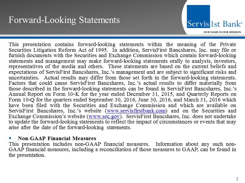 Forward - Looking Statements This presentation contains forward - looking statements within the meaning of the Private Securities Litigation Reform Act of 1995 . In addition, ServisFirst Bancshares, Inc . may file or furnish documents with the Securities and Exchange Commission which contain forward - looking statements and management may make forward - looking statements orally to analysts, investors, representatives of the media and others . These statements are based on the current beliefs and expectations of ServisFirst Bancshares, Inc . ’s management and are subject to significant risks and uncertainties . Actual results may differ from those set forth in the forward - looking statements . Factors that could cause ServisFirst Bancshares, Inc . ’s actual results to differ materially from those described in the forward - looking statements can be found in ServisFirst Bancshares, Inc . ’s Annual Report on Form 10 - K for the year ended December 31 , 2015 , and Quarterly Reports on Form 10 - Q for the quarters ended September 30 , 2016 , June 30 , 2016 , and March 31 , 2016 which have been filed with the Securities and Exchange Commission and which are available on ServisFirst Bancshares, Inc . ’s website ( www . servisfirstbank . com ) and on the Securities and Exchange Commission’s website ( www . sec . gov ) . ServisFirst Bancshares, Inc . does not undertake to update the forward - looking statements to reflect the impact of circumstances or events that may arise after the date of the forward - looking statements . ▪ Non - GAAP Financial Measures This presentation includes non - GAAP financial measures . Information about any such non - GAAP financial measures, including a reconciliation of those measures to GAAP, can be found in the presentation . 2