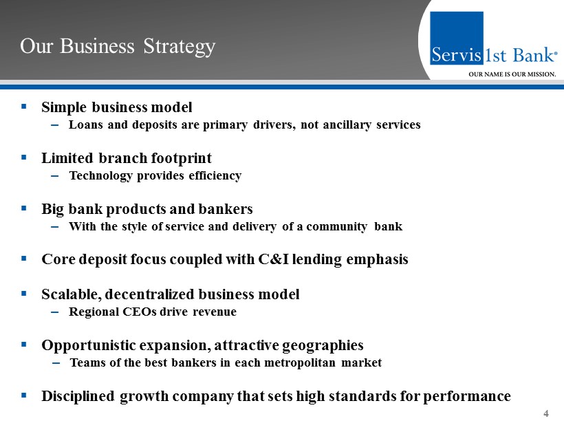 ServisFirst at a Glance Overview ▪ Founded in 2005 in Birmingham, AL ▪ Single bank BHC High - Performing Metropolitan Commercial Bank ▪ Total Assets (1) : $6.4 billion ▪ Stockholders’ Equity (1) : $523 million High Growth Coupled with Pristine Credit Metrics (3) ▪ Gross Loans CAGR: 22% ▪ Total Deposits CAGR: 20% ▪ Net Income for Common CAGR: 29% ▪ Diluted EPS CAGR: 21% 3 ▪ ROAA (2) : 1.42% ▪ Efficiency Ratio (2) : 39.47% 1) As of December 31, 2016 2) For twelve months ended December 31, 2016 3) 5 - year compounded annual growth rate calculated from December 31, 2011 to December 31, 2016 ▪ NPAs / assets (1) : 0.34% ▪ NPLs / loans (1) : 0.34%