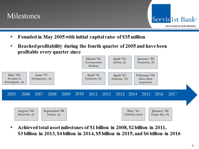 Opportunistic Expansion ▪ Identify great bankers in attractive markets – Focus on people as opposed to places – Target minimum of $300 million in assets within 3 years – Best bankers in growing markets ▪ Market strategies – Regional CEOs execute simple business model – Back office support and risk management infrastructure – Non - legal board of directors comprised of key business people – Provide professional banking services to mid - market commercial customers that have been neglected or pushed down to branch personnel by national and other larger regional banks ▪ Opportunistic future expansion – Southern markets, metropolitan focus – Draw on expertise of industry contacts 5