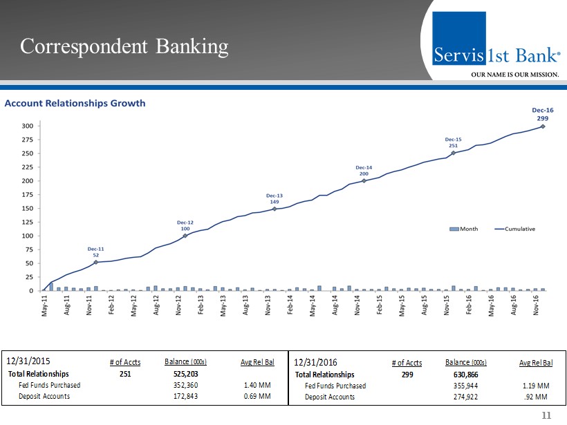 Scalable, Decentralized Structure ▪ Local decision - making – Emphasize local decision - making to drive customer revenue – Centralized, uniform risk management and support – Conservative local lending authorities, covers most lending decisions ▪ Geographic organizational structure (as opposed to line of business structure) ▪ Regional CEOs empowered and held accountable – Utilize stock based compensation to align goals ▪ Top - down sales culture – Senior management actively involved in customer acquisition 10