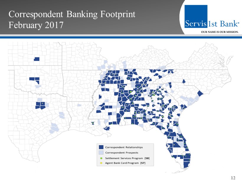 Correspondent Banking 11 12/31/2015 # of Accts Balance (000s) Avg Rel Bal Total Relationships 251 525,203 Fed Funds Purchased 352,360 1.40 MM Deposit Accounts 172,843 0.69 MM 12/31/2016 # of Accts Balance (000s) Avg Rel Bal Total Relationships 299 630,866 Fed Funds Purchased 355,944 1.19 MM Deposit Accounts 274,922 .92 MM