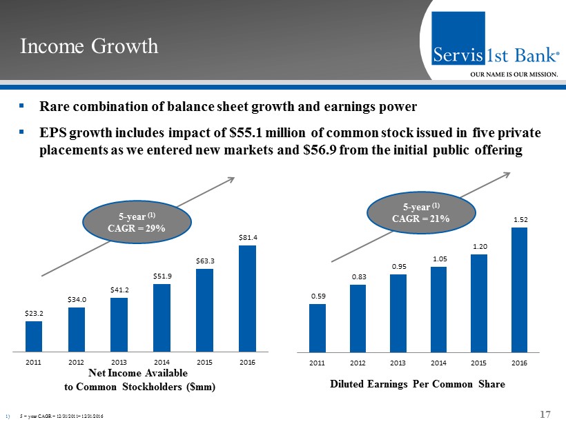 Balance Sheet Growth 16 5 - year (1) CAGR = 22% 5 - year (1) CAGR = 20% Gross Loans ($mm) Total Deposits ($mm) ▪ Organic growth of gross loans and total deposits in the 20% range ▪ 5 - year (1) CAGR of non - interest bearing deposits = 25% ▪ 5 - year (1) CAGR of C&I loans = 20% $1,831 $2,363 $2,859 $3,360 $4,216 $4,912 2011 2012 2013 2014 2015 2016 1) 5 – year CAGR = 12/31/2011 – 12/31/2016 $2,144 $2,512 $3,020 $3,398 $4,224 $5,420 2011 2012 2013 2014 2015 2016