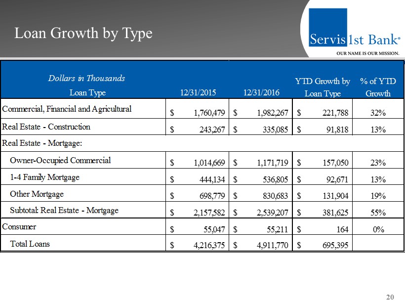 Loan Growth by Region 19 12/31/2015 12/31/2016 YTD Growth 2016 Growth Rate Birmingham, AL 1,944,161$ 2,155,907$ 211,746$ 11% Nashville, TN 268,987$ 403,490$ 134,503$ 50% Tampa Bay, FL -$ 68,966$ 68,966$ NA Mobile, AL 229,935$ 287,273$ 57,338$ 25% Dothan, AL 423,944$ 479,623$ 55,679$ 13% Charleston, SC 74,067$ 126,831$ 52,764$ 71% Huntsville, AL 445,547$ 490,926$ 45,379$ 10% Atlanta, GA 156,819$ 188,597$ 31,778$ 20% Pensacola, FL 310,000$ 340,745$ 30,745$ 10% Montgomery, AL 362,915$ 369,412$ 6,497$ 2% Total Loans 4,216,375$ 4,911,770$ 695,395$ 16% Dollars in Thousands Region