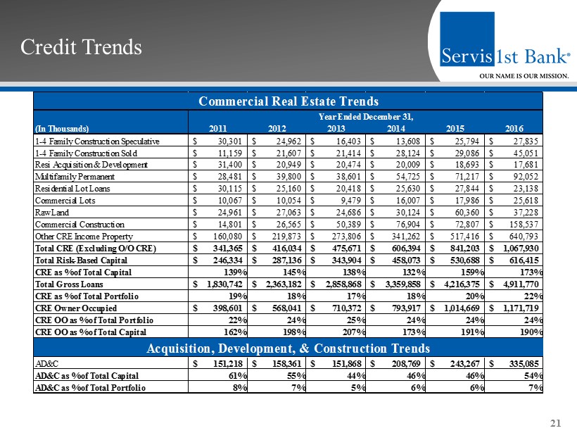 Loan Growth by Type 20 Dollars in Thousands Loan Type 12/31/2015 12/31/2016 1,760,479$ 1,982,267$ 221,788$ 32% 243,267$ 335,085$ 91,818$ 13% Owner-Occupied Commercial 1,014,669$ 1,171,719$ 157,050$ 23% 1-4 Family Mortgage 444,134$ 536,805$ 92,671$ 13% Other Mortgage 698,779$ 830,683$ 131,904$ 19% Subtotal: Real Estate - Mortgage 2,157,582$ 2,539,207$ 381,625$ 55% 55,047$ 55,211$ 164$ 0% Total Loans 4,216,375$ 4,911,770$ 695,395$ YTD Growth by Loan Type % of YTD Growth Real Estate - Mortgage: Commercial, Financial and Agricultural Real Estate - Construction Consumer