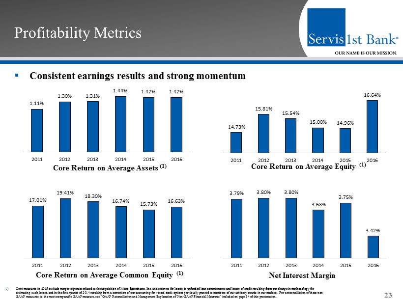▪ Strong loan growth while maintaining asset quality discipline Credit Quality 22 Allowance for Loan Losses / Total Loans Net Charge Offs / Total Average Loans Non - Performing Assets / Total Assets Non - Performing Loans / Total Loans 1.06% 0.69% 0.64% 0.41% 0.26% 0.34% 2011 2012 2013 2014 2015 2016 0.75% 0.44% 0.34% 0.30% 0.18% 0.34% 2011 2012 2013 2014 2015 2016 0.32% 0.24% 0.33% 0.17% 0.13% 0.11% 2011 2012 2013 2014 2015 2016 1.20% 1.11% 1.07% 1.06% 1.03% 1.06% 2011 2012 2013 2014 2015 2016