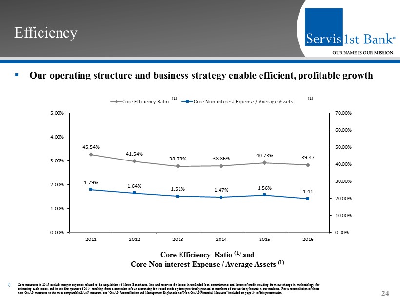 ▪ Consistent earnings results and strong momentum Profitability Metrics 23 Core Return on Average Assets (1) Core Return on Average Equity (1) Core Return on Average Common Equity (1) Net Interest Margin 1) Core measures in 2015 exclude merger expenses related to the acquisition of Metro Bancshares, Inc. and reserves for losses in un funded loan commitments and letters of credit resulting from our change in methodology for estimating such losses, and in the first quarter of 2014 resulting from a correction of our accounting for vested stock optio ns previously granted to members of our advisory boards in our markets. For a reconciliation of these non - GAAP measures to the most comparable GAAP measure, see "GAAP Reconciliation and Management Explanation of Non - GAAP Financial Mea sures" included on page 34 of this presentation. 1.11% 1.30% 1.31% 1.44% 1.42% 1.42% 2011 2012 2013 2014 2015 2016 17.01% 19.41% 18.30% 16.74% 15.73% 16.63% 2011 2012 2013 2014 2015 2016 3.79% 3.80% 3.80% 3.68% 3.75% 3.42% 2011 2012 2013 2014 2015 2016 14.73% 15.81% 15.54% 15.00% 14.96% 16.64% 2011 2012 2013 2014 2015 2016