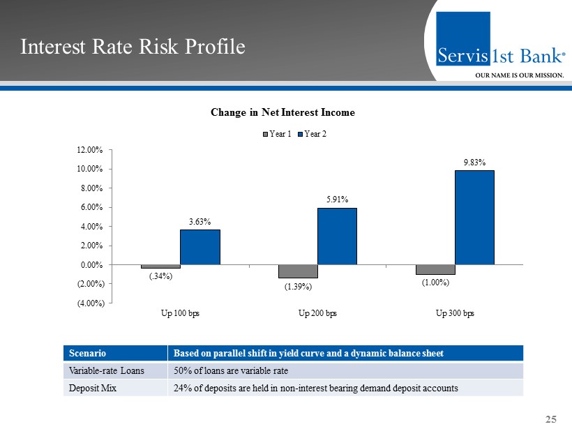 ▪ Our operating structure and business strategy enable efficient, profitable growth Efficiency 24 Core Efficiency Ratio (1) and Core Non - interest Expense / Average Assets (1) (1) (1) 45.54% 41.54% 38.78% 38.86% 40.73% 39.47 1.79% 1.64% 1.51% 1.47% 1.56% 1.41 0.00% 1.00% 2.00% 3.00% 4.00% 5.00% 2011 2012 2013 2014 2015 2016 0.00% 10.00% 20.00% 30.00% 40.00% 50.00% 60.00% 70.00% Core Efficiency Ratio Core Non-interest Expense / Average Assets 1) Core measures in 2015 exclude merger expenses related to the acquisition of Metro Bancshares, Inc . and reserves for losses in unfunded loan commitments and letters of credit resulting from our change in methodology for estimating such losses, and in the first quarter of 2014 resulting from a correction of our accounting for vested stock options previously granted to members of our advisory boards in our markets . For a reconciliation of these non - GAAP measures to the most comparable GAAP measure, see "GAAP Reconciliation and Management Explanation of Non - GAAP Financial Measures" included on page 34 of this presentation .