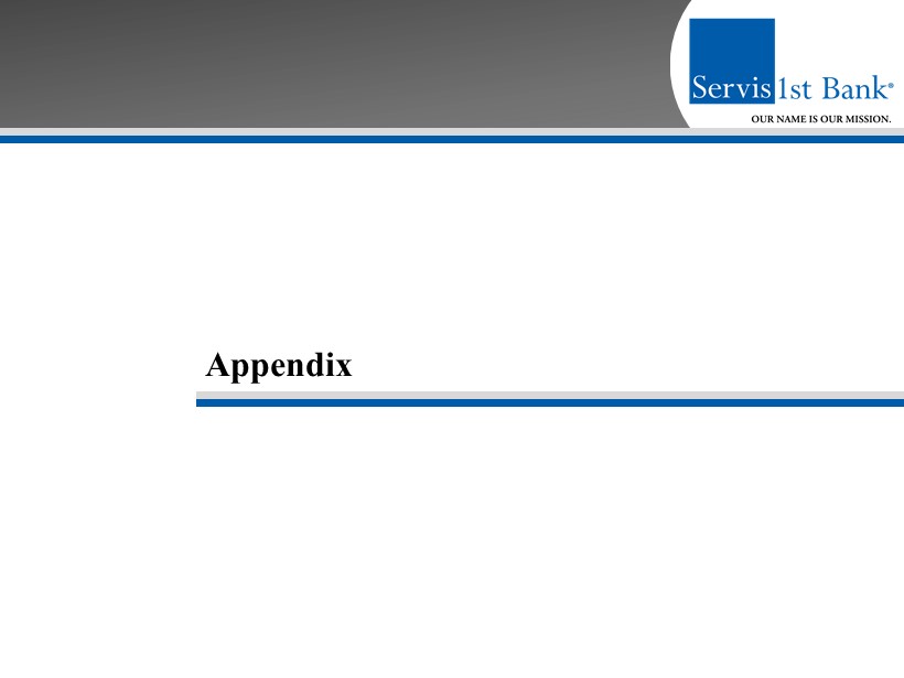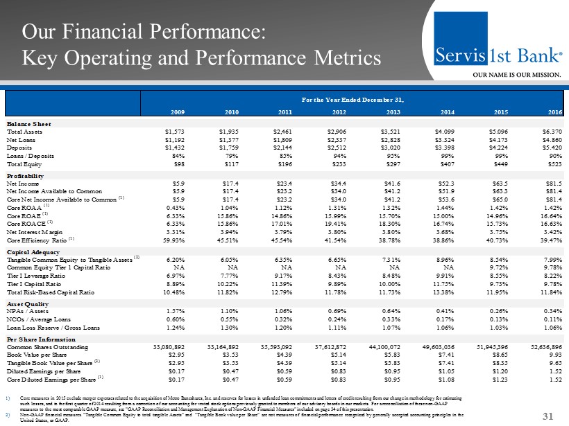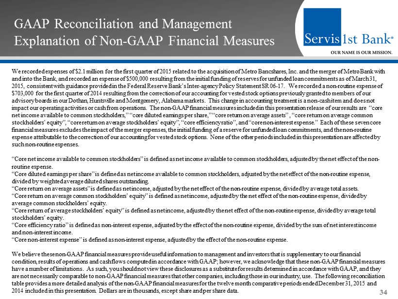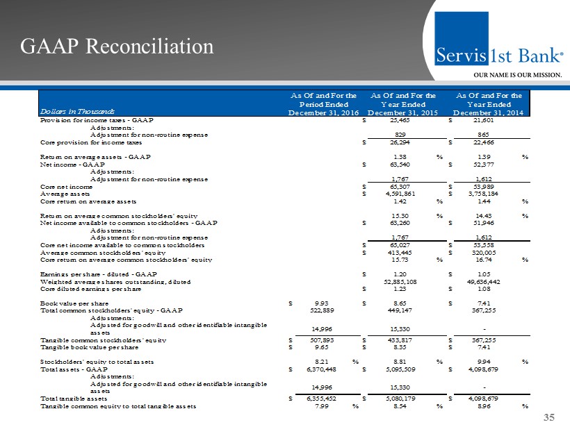 GAAP Reconciliation and Management Explanation of Non - GAAP Financial Measures 34 We recorded expenses of $2.1 million for the first quarter of 2015 related to the acquisition of Metro Bancshares, Inc. and t he merger of Metro Bank with and into the Bank, and recorded an expense of $500,000 resulting from the initial funding of reserves for unfunded loan commi tme nts as of March 31, 2015, consistent with guidance provided in the Federal Reserve Bank’s Inter - agency Policy Statement SR 06 - 17. We recorded a non - routine expense of $703,000 for the first quarter of 2014 resulting from the correction of our accounting for vested stock options previously gr ant ed to members of our advisory boards in our Dothan, Huntsville and Montgomery, Alabama markets. This change in accounting treatment is a non - cash it em and does not impact our operating activities or cash from operations. The non - GAAP financial measures included in this presentation release of our results are “core net income available to common stockholders,” “core diluted earnings per share,” “core return on average assets” , “core retu rn on average common stockholders’ equity”, “core return on average stockholders’ equity”, “core efficiency ratio”, and “core non - interest expense.” Each of these seven core financial measures excludes the impact of the merger expenses, the initial funding of a reserve for unfunded loan commitments , a nd the non - routine expense attributable to the correction of our accounting for vested stock options. None of the other periods included in thi s p resentation are affected by such non - routine expenses. “Core net income available to common stockholders” is defined as net income available to common stockholders, adjusted by the ne t effect of the non - routine expense. “Core diluted earnings per share” is defined as net income available to common stockholders, adjusted by the net effect of th e n on - routine expense, divided by weighted average diluted shares outstanding. “Core return on average assets” is defined as net income, adjusted by the net effect of the non - routine expense, divided by aver age total assets. “Core return on average common stockholders’ equity” is defined as net income, adjusted by the net effect of the non - routine exp ense, divided by average common stockholders’ equity. “Core return of average stockholders’ equity” is defined as net income, adjusted by the net effect of the non - routine expense, d ivided by average total stockholders’ equity. “Core efficiency ratio” is defined as non - interest expense, adjusted by the effect of the non - routine expense, divided by the su m of net interest income and non - interest income. “Core non - interest expense” is defined as non - interest expense, adjusted by the effect of the non - routine expense. We believe these non - GAAP financial measures provide useful information to management and investors that is supplementary to our financial condition, results of operations and cash flows computed in accordance with GAAP; however, we acknowledge that these non - GAAP fi nancial measures have a number of limitations. As such, you should not view these disclosures as a substitute for results determined in accor dan ce with GAAP, and they are not necessarily comparable to non - GAAP financial measures that other companies, including those in our industry, use. The f ollowing reconciliation table provides a more detailed analysis of the non - GAAP financial measures for the twelve month comparative periods ended Decemb er 31, 2015 and 2014 included in this presentation. Dollars are in thousands, except share and per share data.