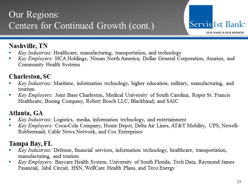 Our Regions: Centers for Continued Growth (cont.) Dothan, AL ▪ Key Industries: Agriculture, manufacturing, and healthcare services ▪ Key Employers: Southeast Alabama Medical Center, Wayne Farms, Southern Nuclear, Michelin Tire, Pemco World Air Services, Globe Motors, and AAA Cooper Transportation Pensacola, FL ▪ Key Industries: Military, health services, medical technology industries, and tourism ▪ Key Employers: Eglin Air Force Base, Hurlburt Field, Pensacola Whiting Field, Pensacola Naval Air Station and Corry Station, Sacred Heart Health System, West Florida Regional Hospital, Gulf Power Company, University of West Florida, Solutia, and GE Wind Energy Mobile, AL ▪ Key Industries: Aircraft assembly, aerospace, steel, ship building, maritime, construction, medicine, and manufacturing ▪ Key Employers: Port of Mobile, Infirmary Health Systems, Austal USA, Brookley Aeroplex , ThyssenKrupp, Infirmary Health Systems, University of South Alabama, ST Aerospace Mobile, and EADS 28