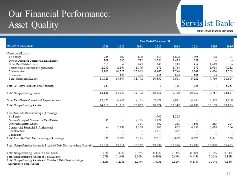 Our Financial Performance: Key Operating and Performance Metrics 31 2009 2010 2011 2012 2013 2014 2015 2016 Balance Sheet Total Assets $1,573 $1,935 $2,461 $2,906 $3,521 $4.099 $5.096 $6.370 Net Loans $1,192 $1,377 $1,809 $2,337 $2,828 $3.324 $4.173 $4.860 Deposits $1,432 $1,759 $2,144 $2,512 $3,020 $3.398 $4.224 $5.420 Loans / Deposits 84% 79% 85% 94% 95% 99% 99% 90% Total Equity $98 $117 $196 $233 $297 $407 $449 $523 Profitability Net Income $5.9 $17.4 $23.4 $34.4 $41.6 $52.3 $63.5 $81.5 Net Income Available to Common $5.9 $17.4 $23.2 $34.0 $41.2 $51.9 $63.3 $81.4 Core Net Income Available to Common (1) $5.9 $17.4 $23.2 $34.0 $41.2 $53.6 $65.0 $81.4 Core ROAA (1) 0.43% 1.04% 1.12% 1.31% 1.32% 1.44% 1.42% 1.42% Core ROAE (1) 6.33% 15.86% 14.86% 15.99% 15.70% 15.00% 14.96% 16.64% Core ROACE (1) 6.33% 15.86% 17.01% 19.41% 18.30% 16.74% 15.73% 16.63% Net Interest Margin 3.31% 3.94% 3.79% 3.80% 3.80% 3.68% 3.75% 3.42% Core Efficiency Ratio (1) 59.93% 45.51% 45.54% 41.54% 38.78% 38.86% 40.73% 39.47% Capital Adequacy Tangible Common Equity to Tangible Assets (2) 6.20% 6.05% 6.35% 6.65% 7.31% 8.96% 8.54% 7.99% Common Equity Tier 1 Capital Ratio NA NA NA NA NA NA 9.72% 9.78% Tier I Leverage Ratio 6.97% 7.77% 9.17% 8.43% 8.48% 9.91% 8.55% 8.22% Tier I Capital Ratio 8.89% 10.22% 11.39% 9.89% 10.00% 11.75% 9.73% 9.78% Total Risk-Based Capital Ratio 10.48% 11.82% 12.79% 11.78% 11.73% 13.38% 11.95% 11.84% Asset Quality NPAs / Assets 1.57% 1.10% 1.06% 0.69% 0.64% 0.41% 0.26% 0.34% NCOs / Average Loans 0.60% 0.55% 0.32% 0.24% 0.33% 0.17% 0.13% 0.11% Loan Loss Reserve / Gross Loans 1.24% 1.30% 1.20% 1.11% 1.07% 1.06% 1.03% 1.06% Per Share Information Common Shares Outstanding 33,080,892 33,164,892 35,593,092 37,612,872 44,100,072 49,603,036 51,945,396 52,636,896 Book Value per Share $2.95 $3.53 $4.39 $5.14 $5.83 $7.41 $8.65 9.93 Tangible Book Value per Share (2) $2.95 $3.53 $4.39 $5.14 $5.83 $7.41 $8.35 9.65 Diluted Earnings per Share $0.17 $0.47 $0.59 $0.83 $0.95 $1.05 $1.20 1.52 Core Diluted Earnings per Share (1) $0.17 $0.47 $0.59 $0.83 $0.95 $1.08 $1.23 1.52 For the Year Ended December 31, 1) Core measures in 2015 exclude merger expenses related to the acquisition of Metro Bancshares, Inc. and reserves for losses in un funded loan commitments and letters of credit resulting from our change in methodology for estimating such losses, and in the first quarter of 2014 resulting from a correction of our accounting for vested stock options previous ly granted to members of our advisory boards in our markets. For a reconciliation of these non - GAAP measures to the most comparable GAAP measure, see "GAAP Reconciliation and Management Explanation of Non - GAAP Financial Measures " included on page 34 of this presentation. 2) Non - GAAP financial measures . "Tangible Common Equity to total tangible Assets" and "Tangible Book value per Share" are not measures of financial performance recognized by generally accepted accounting principles in the United States, or GAAP .