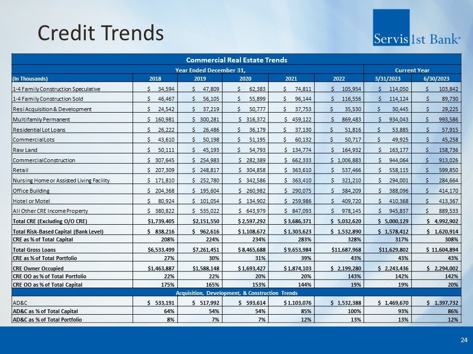 Risk-Based Capital (Bank Level) $ 838,216 $ 962,616 $ 1,108,672 $ 1,303,623 $ 1,532,890 $ 1,578,412 $ 1,620,914 CRE as % of Total Capital 208% 224% 234% 283% 328% 317% 308% Total Gross Loans $6,533,499