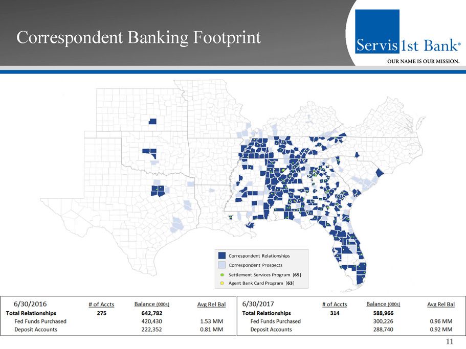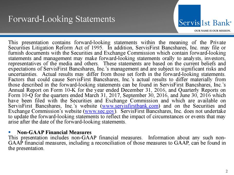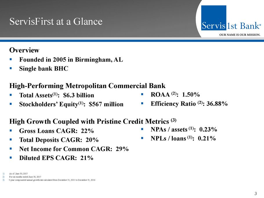 Forward - Looking Statements This presentation contains forward - looking statements within the meaning of the Private Securities Litigation Reform Act of 1995 . In addition, ServisFirst Bancshares, Inc . may file or furnish documents with the Securities and Exchange Commission which contain forward - looking statements and management may make forward - looking statements orally to analysts, investors, representatives of the media and others . These statements are based on the current beliefs and expectations of ServisFirst Bancshares, Inc . ’s management and are subject to significant risks and uncertainties . Actual results may differ from those set forth in the forward - looking statements . Factors that could cause ServisFirst Bancshares, Inc . ’s actual results to differ materially from those described in the forward - looking statements can be found in ServisFirst Bancshares, Inc . ’s Annual Report on Form 10 - K for the year ended December 31 , 2016 , and Quarterly Reports on Form 10 - Q for the quarters ended March 31 , 2017 , September 30 , 2016 , and June 30 , 2016 which have been filed with the Securities and Exchange Commission and which are available on ServisFirst Bancshares, Inc . ’s website ( www . servisfirstbank . com ) and on the Securities and Exchange Commission’s website ( www . sec . gov ) . ServisFirst Bancshares, Inc . does not undertake to update the forward - looking statements to reflect the impact of circumstances or events that may arise after the date of the forward - looking statements . ▪ Non - GAAP Financial Measures This presentation includes non - GAAP financial measures . Information about any such non - GAAP financial measures, including a reconciliation of those measures to GAAP, can be found in the presentation . 2