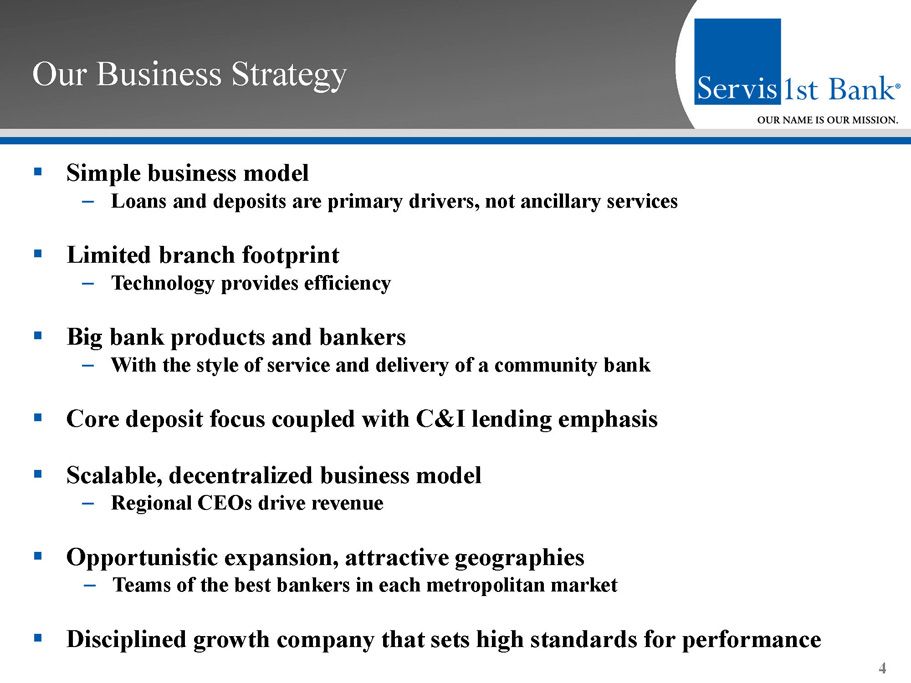 ServisFirst at a Glance Overview ▪ Founded in 2005 in Birmingham, AL ▪ Single bank BHC High - Performing Metropolitan Commercial Bank ▪ Total Assets (1) : $6.3 billion ▪ Stockholders’ Equity (1) : $567 million High Growth Coupled with Pristine Credit Metrics (3) ▪ Gross Loans CAGR: 22% ▪ Total Deposits CAGR: 20% ▪ Net Income for Common CAGR: 29% ▪ Diluted EPS CAGR: 21% 3 ▪ ROAA (2) : 1.50% ▪ Efficiency Ratio (2) : 36.88% 1) As of June 30, 2017 2) For six months ended June 30, 2017 3) 5 - year compounded annual growth rate calculated from December 31, 2011 to December 31, 2016 ▪ NPAs / assets (1) : 0.23% ▪ NPLs / loans (1) : 0.21%