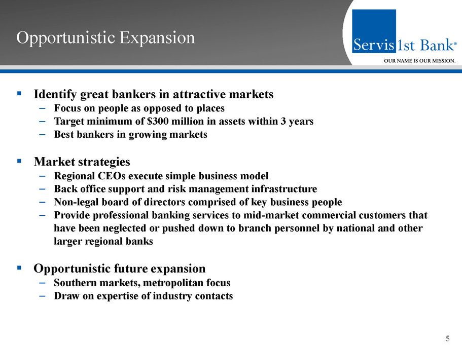 Our Business Strategy ▪ Simple business model – Loans and deposits are primary drivers, not ancillary services ▪ Limited branch footprint – Technology provides efficiency ▪ Big bank products and bankers – With the style of service and delivery of a community bank ▪ Core deposit focus coupled with C&I lending emphasis ▪ Scalable, decentralized business model – Regional CEOs drive revenue ▪ Opportunistic expansion, attractive geographies – Teams of the best bankers in each metropolitan market ▪ Disciplined growth company that sets high standards for performance 4