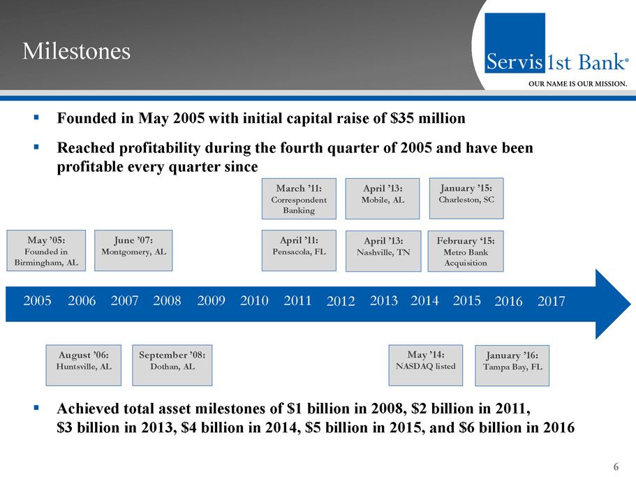 Opportunistic Expansion ▪ Identify great bankers in attractive markets – Focus on people as opposed to places – Target minimum of $300 million in assets within 3 years – Best bankers in growing markets ▪ Market strategies – Regional CEOs execute simple business model – Back office support and risk management infrastructure – Non - legal board of directors comprised of key business people – Provide professional banking services to mid - market commercial customers that have been neglected or pushed down to branch personnel by national and other larger regional banks ▪ Opportunistic future expansion – Southern markets, metropolitan focus – Draw on expertise of industry contacts 5