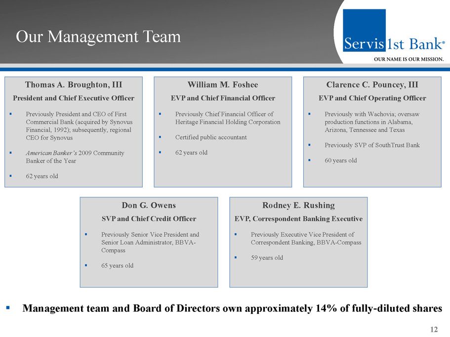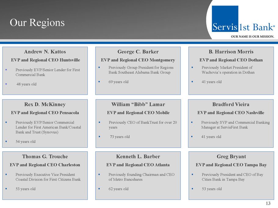 Our Management Team Thomas A. Broughton, III President and Chief Executive Officer ▪ Previously President and CEO of First Commercial Bank (acquired by Synovus Financial, 1992); subsequently, regional CEO for Synovus ▪ American Banker’s 2009 Community Banker of the Year ▪ 62 years old 12 William M. Foshee EVP and Chief Financial Officer ▪ Previously Chief Financial Officer of Heritage Financial Holding Corporation ▪ Certified public accountant ▪ 62 years old Clarence C. Pouncey , III EVP and Chief Operating Officer ▪ Previously with Wachovia; oversaw production functions in Alabama, Arizona, Tennessee and Texas ▪ Previously SVP of SouthTrust Bank ▪ 60 years old Don G. Owens SVP and Chief Credit Officer ▪ Previously Senior Vice President and Senior Loan Administrator, BBVA - Compass ▪ 65 years old Rodney E. Rushing EVP, Correspondent Banking Executive ▪ Previously Executive Vice President of Correspondent Banking, BBVA - Compass ▪ 59 years old ▪ Management team and Board of Directors own approximately 14% of fully - diluted shares