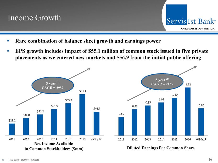 Balance Sheet Growth 15 5 - year (1) CAGR = 22% 5 - year (1) CAGR = 20% Gross Loans ($mm) Total Deposits ($mm) ▪ Organic growth of gross loans and total deposits in the 20% range ▪ 5 - year (1) CAGR of non - interest bearing deposits = 25% ▪ 5 - year (1) CAGR of C&I loans = 20% $1,831 $2,363 $2,859 $3,360 $4,216 $4,912 $5,344 2011 2012 2013 2014 2015 2016 6/30/17 1) 5 – year CAGR = 12/31/2011 – 12/31/2016 $2,144 $2,512 $3,020 $3,398 $4,224 $5,420 $5,395 2011 2012 2013 2014 2015 2016 6/30/17