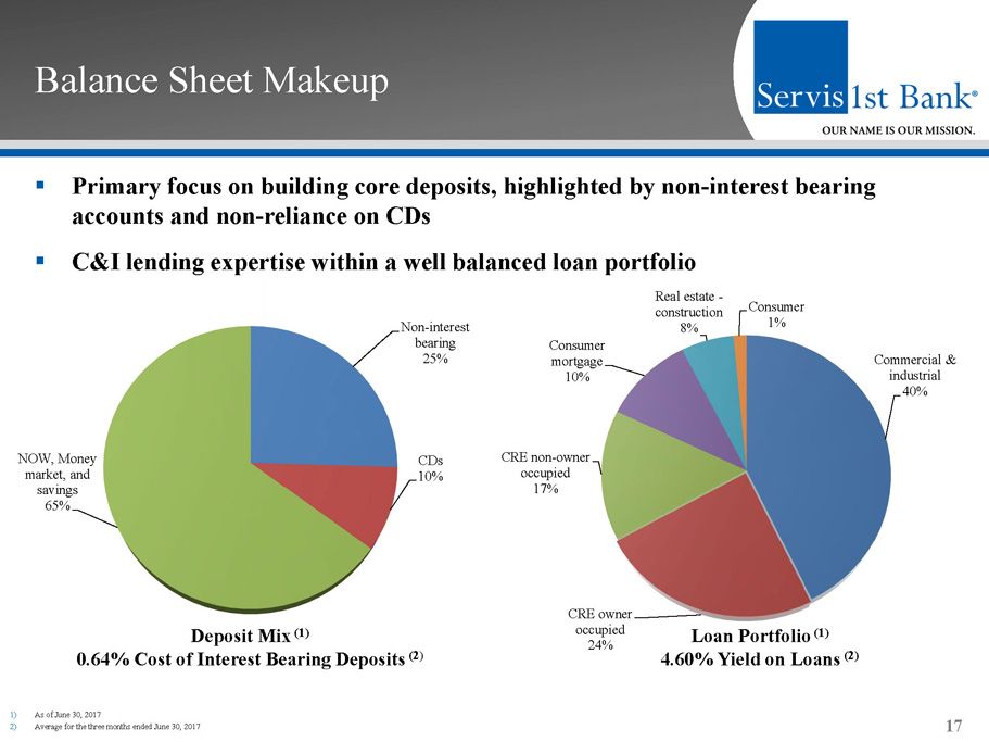 ▪ Rare combination of balance sheet growth and earnings power ▪ EPS growth includes impact of $55.1 million of common stock issued in five private placements as we entered new markets and $56.9 from the initial public offering Income Growth 16 5 - year (1) CAGR = 29% 5 - year (1) CAGR = 21% Net Income Available to Common Stockholders ($mm) Diluted Earnings Per Common Share $23.2 $34.0 $41.2 $51.9 $63.3 $81.4 $46.7 2011 2012 2013 2014 2015 2016 6/30/17 0.59 0.83 0.95 1.05 1.20 1.52 0.86 2011 2012 2013 2014 2015 2016 6/30/17 1) 5 – year CAGR = 12/31/2011 – 12/31/2016