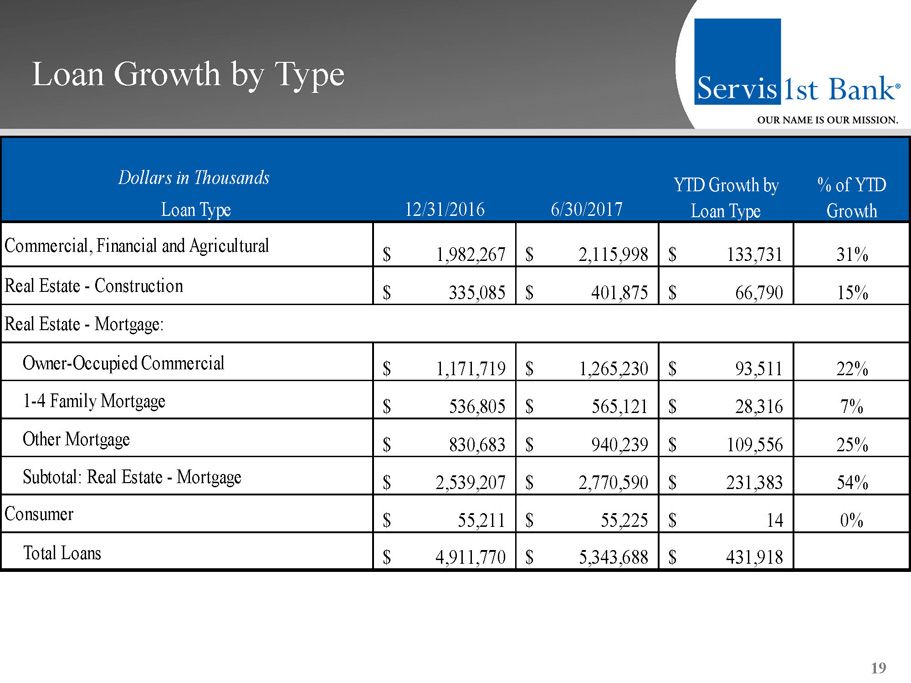 Loan Growth by Region 18 12/31/2016 6/30/2017 YTD Growth 2017 Annualized Growth Rate Birmingham, AL 2,155,907$ 2,299,024$ 143,117$ 13% Dothan, AL 479,623$ 524,122$ 44,499$ 19% Nashville, TN 403,490$ 446,645$ 43,155$ 22% Charleston, SC 126,831$ 165,601$ 38,770$ 62% Huntsville, AL 490,926$ 529,400$ 38,474$ 16% Mobile, AL 287,273$ 319,230$ 31,957$ 22% Atlanta, GA 188,597$ 220,089$ 31,492$ 34% Tampa Bay, FL 68,966$ 97,965$ 28,999$ 85% Montgomery, AL 369,412$ 396,111$ 26,699$ 15% Pensacola, FL 340,745$ 345,501$ 4,756$ 3% Total Loans 4,911,770$ 5,343,688$ 431,918$ 18% Dollars in Thousands Region