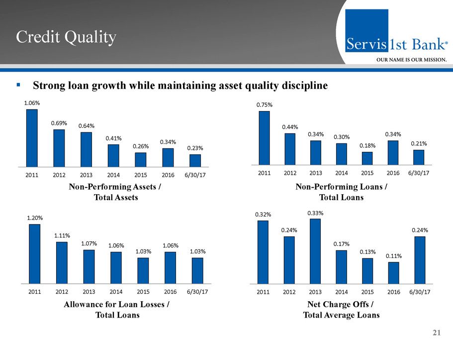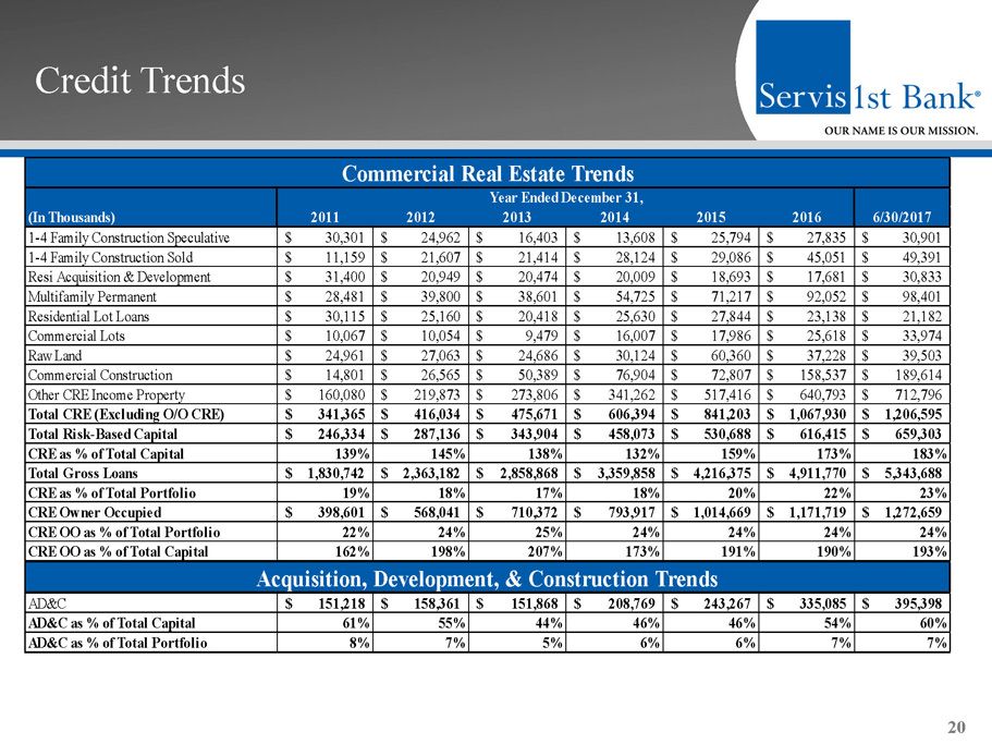 Credit Trends 20 (In Thousands) 2011 2012 2013 2014 2015 2016 6/30/2017 1-4 Family Construction Speculative 30,301$ 24,962$ 16,403$ 13,608$ 25,794$ 27,835$ 30,901$ 1-4 Family Construction Sold 11,159$ 21,607$ 21,414$ 28,124$ 29,086$ 45,051$ 49,391$ Resi Acquisition & Development 31,400$ 20,949$ 20,474$ 20,009$ 18,693$ 17,681$ 30,833$ Multifamily Permanent 28,481$ 39,800$ 38,601$ 54,725$ 71,217$ 92,052$ 98,401$ Residential Lot Loans 30,115$ 25,160$ 20,418$ 25,630$ 27,844$ 23,138$ 21,182$ Commercial Lots 10,067$ 10,054$ 9,479$ 16,007$ 17,986$ 25,618$ 33,974$ Raw Land 24,961$ 27,063$ 24,686$ 30,124$ 60,360$ 37,228$ 39,503$ Commercial Construction 14,801$ 26,565$ 50,389$ 76,904$ 72,807$ 158,537$ 189,614$ Other CRE Income Property 160,080$ 219,873$ 273,806$ 341,262$ 517,416$ 640,793$ 712,796$ Total CRE (Excluding O/O CRE) 341,365$ 416,034$ 475,671$ 606,394$ 841,203$ 1,067,930$ 1,206,595$ Total Risk-Based Capital 246,334$ 287,136$ 343,904$ 458,073$ 530,688$ 616,415$ 659,303$ CRE as % of Total Capital 139% 145% 138% 132% 159% 173% 183% Total Gross Loans 1,830,742$ 2,363,182$ 2,858,868$ 3,359,858$ 4,216,375$ 4,911,770$ 5,343,688$ CRE as % of Total Portfolio 19% 18% 17% 18% 20% 22% 23% CRE Owner Occupied 398,601$ 568,041$ 710,372$ 793,917$ 1,014,669$ 1,171,719$ 1,272,659$ CRE OO as % of Total Portfolio 22% 24% 25% 24% 24% 24% 24% CRE OO as % of Total Capital 162% 198% 207% 173% 191% 190% 193% AD&C 151,218$ 158,361$ 151,868$ 208,769$ 243,267$ 335,085$ 395,398$ AD&C as % of Total Capital 61% 55% 44% 46% 46% 54% 60% AD&C as % of Total Portfolio 8% 7% 5% 6% 6% 7% 7% Year Ended December 31, Commercial Real Estate Trends Acquisition, Development, & Construction Trends