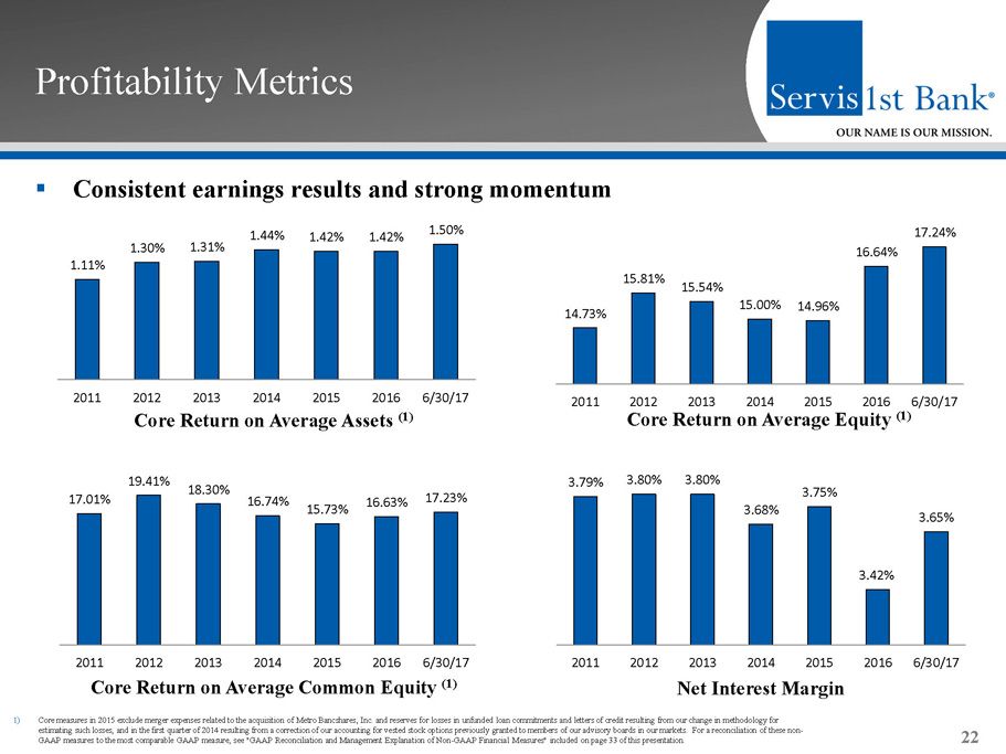 ▪ Strong loan growth while maintaining asset quality discipline Credit Quality 21 Allowance for Loan Losses / Total Loans Net Charge Offs / Total Average Loans Non - Performing Assets / Total Assets Non - Performing Loans / Total Loans 1.06% 0.69% 0.64% 0.41% 0.26% 0.34% 0.23% 2011 2012 2013 2014 2015 2016 6/30/17 0.75% 0.44% 0.34% 0.30% 0.18% 0.34% 0.21% 2011 2012 2013 2014 2015 2016 6/30/17 0.32% 0.24% 0.33% 0.17% 0.13% 0.11% 0.24% 2011 2012 2013 2014 2015 2016 6/30/17 1.20% 1.11% 1.07% 1.06% 1.03% 1.06% 1.03% 2011 2012 2013 2014 2015 2016 6/30/17