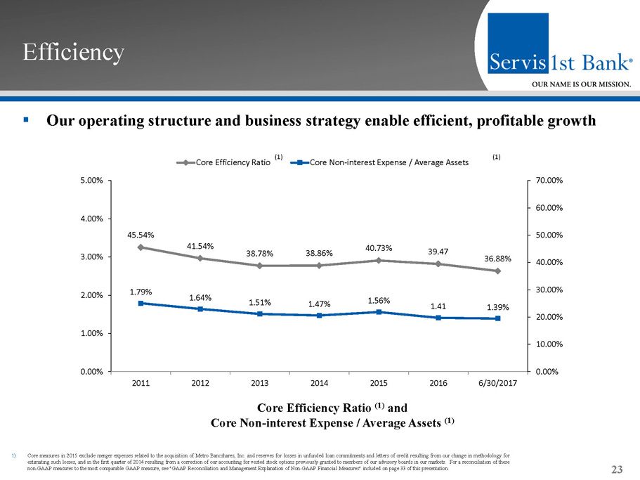 ▪ Consistent earnings results and strong momentum Profitability Metrics 22 Core Return on Average Assets (1) Core Return on Average Equity (1) Core Return on Average Common Equity (1) Net Interest Margin 1) Core measures in 2015 exclude merger expenses related to the acquisition of Metro Bancshares, Inc. and reserves for losses in un funded loan commitments and letters of credit resulting from our change in methodology for estimating such losses, and in the first quarter of 2014 resulting from a correction of our accounting for vested stock optio ns previously granted to members of our advisory boards in our markets. For a reconciliation of these non - GAAP measures to the most comparable GAAP measure, see "GAAP Reconciliation and Management Explanation of Non - GAAP Financial Mea sures" included on page 33 of this presentation. 1.11% 1.30% 1.31% 1.44% 1.42% 1.42% 1.50% 2011 2012 2013 2014 2015 2016 6/30/17 17.01% 19.41% 18.30% 16.74% 15.73% 16.63% 17.23% 2011 2012 2013 2014 2015 2016 6/30/17 3.79% 3.80% 3.80% 3.68% 3.75% 3.42% 3.65% 2011 2012 2013 2014 2015 2016 6/30/17 14.73% 15.81% 15.54% 15.00% 14.96% 16.64% 17.24% 2011 2012 2013 2014 2015 2016 6/30/17