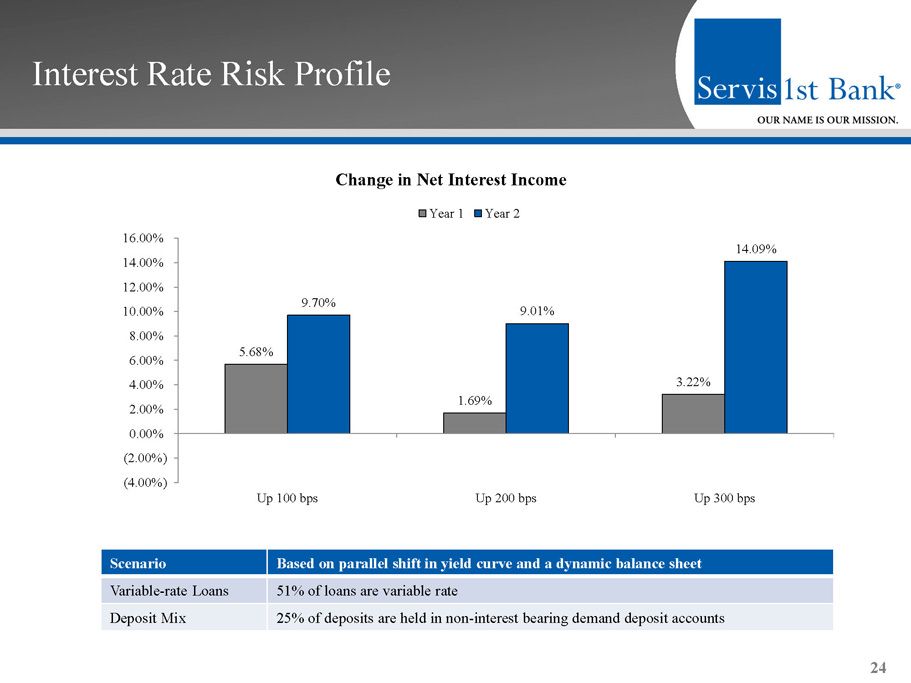 ▪ Our operating structure and business strategy enable efficient, profitable growth Efficiency 23 Core Efficiency Ratio (1) and Core Non - interest Expense / Average Assets (1) (1) (1) 45.54% 41.54% 38.78% 38.86% 40.73% 39.47 36.88% 1.79% 1.64% 1.51% 1.47% 1.56% 1.41 1.39% 0.00% 1.00% 2.00% 3.00% 4.00% 5.00% 2011 2012 2013 2014 2015 2016 6/30/2017 0.00% 10.00% 20.00% 30.00% 40.00% 50.00% 60.00% 70.00% Core Efficiency Ratio Core Non-interest Expense / Average Assets 1) Core measures in 2015 exclude merger expenses related to the acquisition of Metro Bancshares, Inc . and reserves for losses in unfunded loan commitments and letters of credit resulting from our change in methodology for estimating such losses, and in the first quarter of 2014 resulting from a correction of our accounting for vested stock options previously granted to members of our advisory boards in our markets . For a reconciliation of these non - GAAP measures to the most comparable GAAP measure, see "GAAP Reconciliation and Management Explanation of Non - GAAP Financial Measures" included on page 33 of this presentation .