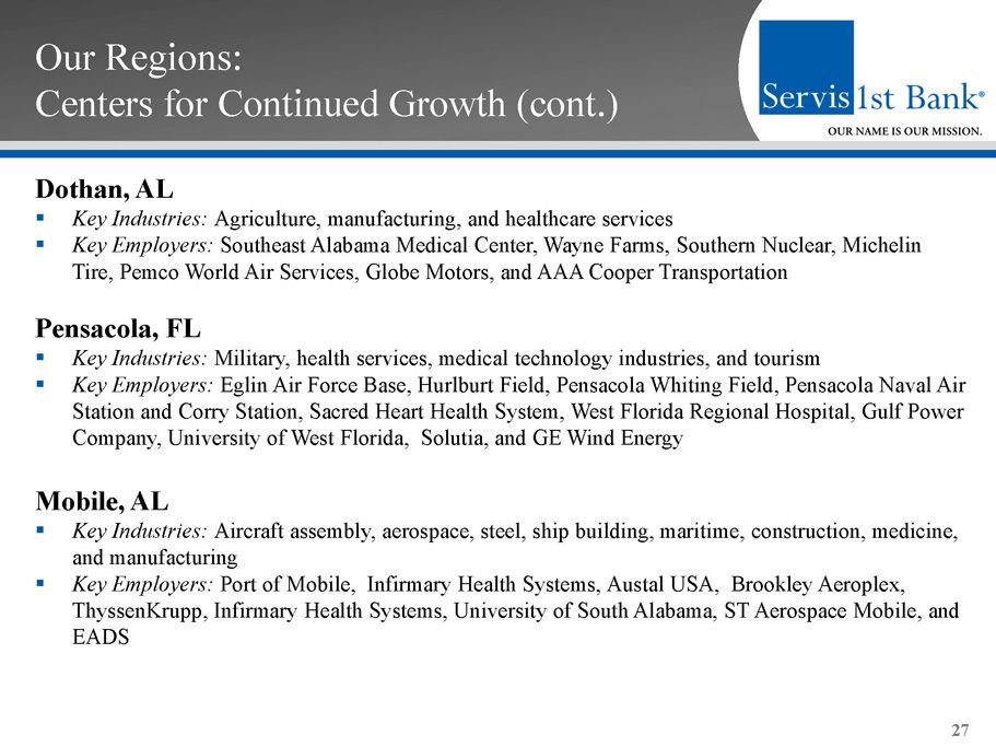 Our Regions: Centers for Continued Growth Birmingham, AL ▪ Key Industries: Metals manufacturing, finance, insurance, healthcare services and distribution ▪ Key Employers: Protective Life, HealthSouth Corporation, Vulcan Materials Company, AT&T, and University of Alabama at Birmingham Huntsville, AL ▪ Key Industries: U.S. government, aerospace/defense, commercial and university research ▪ Key Employers: U.S. Army/Redstone Arsenal, Boeing Company, NASA/Marshall Space Flight Center, Intergraph Corporation, ADTRAN, Northrop Grumman, Cinram, SAIC, DirecTV, Lockheed Martin, and Toyota Motor Manufacturing Montgomery, AL ▪ Key Industries : U.S. and state government, U.S. Air Force , automotive manufacturing ▪ Key Employers: Maxwell Gunter Air Force Base, State of Alabama, Baptist Health Systems, Hyundai Motor Manufacturing, and MOBIS Alabama 26