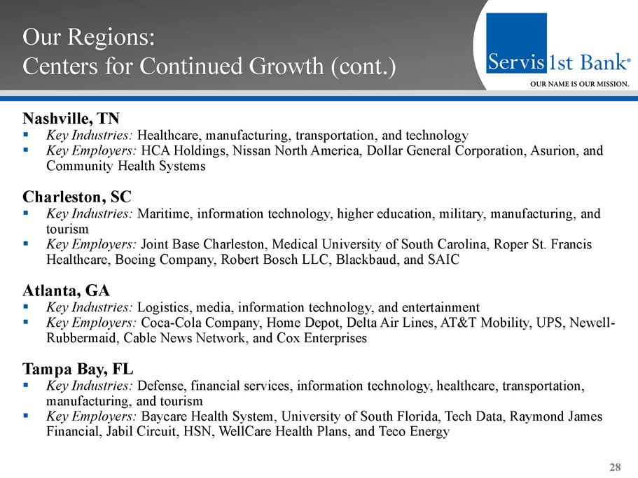 Our Regions: Centers for Continued Growth (cont.) Dothan, AL ▪ Key Industries: Agriculture, manufacturing, and healthcare services ▪ Key Employers: Southeast Alabama Medical Center, Wayne Farms, Southern Nuclear, Michelin Tire, Pemco World Air Services, Globe Motors, and AAA Cooper Transportation Pensacola, FL ▪ Key Industries: Military, health services, medical technology industries, and tourism ▪ Key Employers: Eglin Air Force Base, Hurlburt Field, Pensacola Whiting Field, Pensacola Naval Air Station and Corry Station, Sacred Heart Health System, West Florida Regional Hospital, Gulf Power Company, University of West Florida, Solutia, and GE Wind Energy Mobile, AL ▪ Key Industries: Aircraft assembly, aerospace, steel, ship building, maritime, construction, medicine, and manufacturing ▪ Key Employers: Port of Mobile, Infirmary Health Systems, Austal USA, Brookley Aeroplex , ThyssenKrupp, Infirmary Health Systems, University of South Alabama, ST Aerospace Mobile, and EADS 27