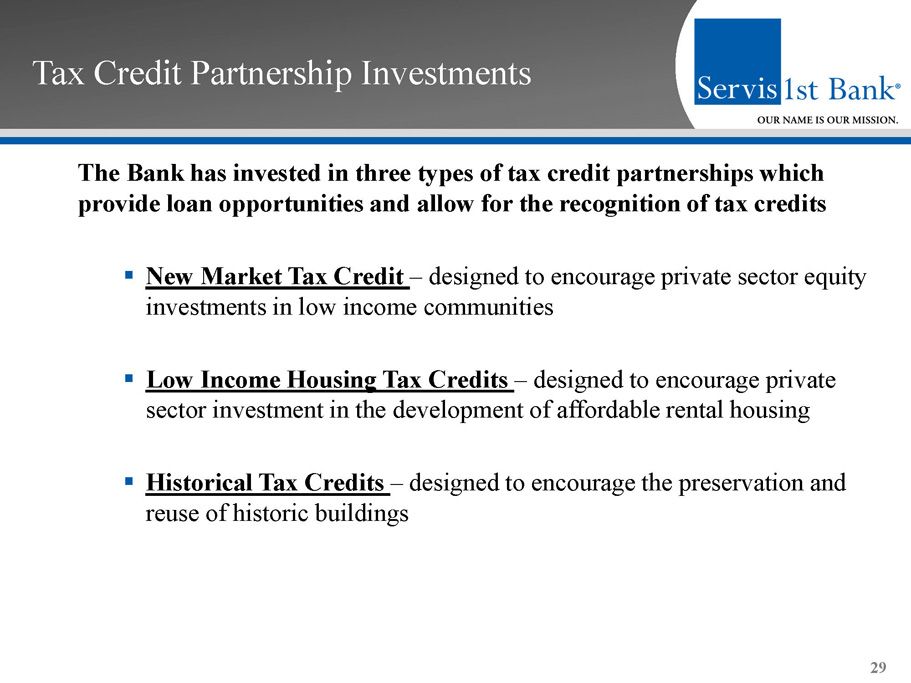Tax Credit Partnership Investments The Bank has invested in three types of tax credit partnerships which provide loan opportunities and allow for the recognition of tax credits ▪ New Market Tax Credit – designed to encourage private sector equity investments in low income communities ▪ Low Income Housing Tax Credits – designed to encourage private sector investment in the development of affordable rental housing ▪ Historical Tax Credits – designed to encourage the preservation and reuse of historic buildings 29