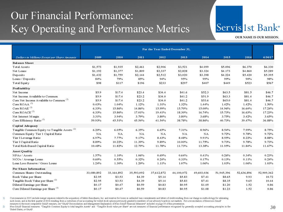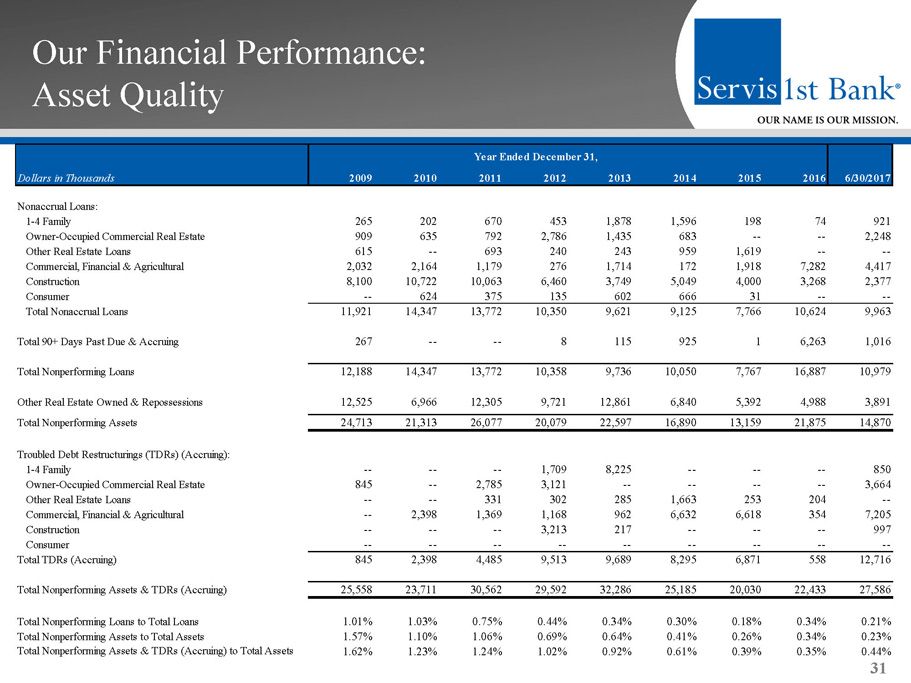 Our Financial Performance: Key Operating and Performance Metrics 30 2009 2010 2011 2012 2013 2014 2015 2016 6/30/17 Balance Sheet Total Assets $1,573 $1,935 $2,461 $2,906 $3,521 $4.099 $5.096 $6.370 $6.330 Net Loans $1,192 $1,377 $1,809 $2,337 $2,828 $3.324 $4.173 $4.860 $5.289 Deposits $1,432 $1,759 $2,144 $2,512 $3,020 $3.398 $4.224 $5.420 $5.395 Loans / Deposits 84% 79% 85% 94% 95% 99% 99% 90% 98% Total Equity $98 $117 $196 $233 $297 $407 $449 $523 $567 Profitability Net Income $5.9 $17.4 $23.4 $34.4 $41.6 $52.3 $63.5 $81.5 $46.7 Net Income Available to Common $5.9 $17.4 $23.2 $34.0 $41.2 $51.9 $63.3 $81.4 $46.7 Core Net Income Available to Common (1) $5.9 $17.4 $23.2 $34.0 $41.2 $53.6 $65.0 $81.4 $46.7 Core ROAA (1) 0.43% 1.04% 1.12% 1.31% 1.32% 1.44% 1.42% 1.42% 1.50% Core ROAE (1) 6.33% 15.86% 14.86% 15.99% 15.70% 15.00% 14.96% 16.64% 17.24% Core ROACE (1) 6.33% 15.86% 17.01% 19.41% 18.30% 16.74% 15.73% 16.63% 17.23% Net Interest Margin 3.31% 3.94% 3.79% 3.80% 3.80% 3.68% 3.75% 3.42% 3.65% Core Efficiency Ratio (1) 59.93% 45.51% 45.54% 41.54% 38.78% 38.86% 40.73% 39.47% 36.88% Capital Adequacy Tangible Common Equity to Tangible Assets (2) 6.20% 6.05% 6.35% 6.65% 7.31% 8.96% 8.54% 7.99% 8.75% Common Equity Tier 1 Capital Ratio NA NA NA NA NA NA 9.72% 9.78% 9.72% Tier I Leverage Ratio 6.97% 7.77% 9.17% 8.43% 8.48% 9.91% 8.55% 8.22% 8.88% Tier I Capital Ratio 8.89% 10.22% 11.39% 9.89% 10.00% 11.75% 9.73% 9.78% 9.73% Total Risk-Based Capital Ratio 10.48% 11.82% 12.79% 11.78% 11.73% 13.38% 11.95% 11.84% 11.67% Asset Quality NPAs / Assets 1.57% 1.10% 1.06% 0.69% 0.64% 0.41% 0.26% 0.34% 0.23% NCOs / Average Loans 0.60% 0.55% 0.32% 0.24% 0.33% 0.17% 0.13% 0.11% 0.24% Loan Loss Reserve / Gross Loans 1.24% 1.30% 1.20% 1.11% 1.07% 1.06% 1.03% 1.06% 1.03% Per Share Information Common Shares Outstanding 33,080,892 33,164,892 35,593,092 37,612,872 44,100,072 49,603,036 51,945,396 52,636,896 52,909,362 Book Value per Share $2.95 $3.53 $4.39 $5.14 $5.83 $7.41 $8.65 9.93 10.72 Tangible Book Value per Share (2) $2.95 $3.53 $4.39 $5.14 $5.83 $7.41 $8.35 9.65 10.44 Diluted Earnings per Share $0.17 $0.47 $0.59 $0.83 $0.95 $1.05 $1.20 1.52 0.86 Core Diluted Earnings per Share (1) $0.17 $0.47 $0.59 $0.83 $0.95 $1.08 $1.23 1.52 0.86 For the Year Ended December 31, Dollars in Millions Except per Share Amounts 1) Core measures in 2015 exclude merger expenses related to the acquisition of Metro Bancshares, Inc. and reserves for losses in un funded loan commitments and letters of credit resulting from our change in methodology for estimating such losses, and in the first quarter of 2014 resulting from a correction of our accounting for vested stock options previous ly granted to members of our advisory boards in our markets. For a reconciliation of these non - GAAP measures to the most comparable GAAP measure, see "GAAP Reconciliation and Management Explanation of Non - GAAP Financial Measures " included on page 33 of this presentation. 2) Non - GAAP financial measures . "Tangible Common Equity to total tangible Assets" and "Tangible Book value per Share" are not measures of financial performance recognized by generally accepted accounting principles in the United States, or GAAP .