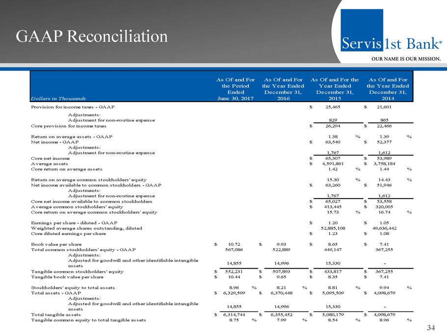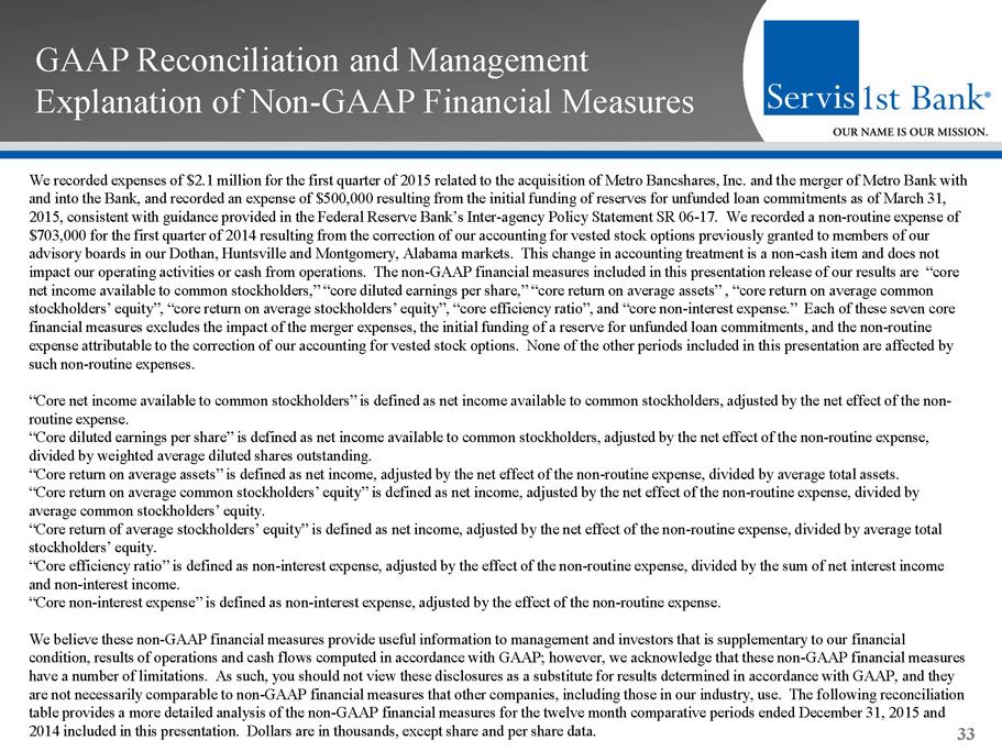 GAAP Reconciliation and Management Explanation of Non - GAAP Financial Measures 33 We recorded expenses of $2.1 million for the first quarter of 2015 related to the acquisition of Metro Bancshares, Inc. and t he merger of Metro Bank with and into the Bank, and recorded an expense of $500,000 resulting from the initial funding of reserves for unfunded loan commi tme nts as of March 31, 2015, consistent with guidance provided in the Federal Reserve Bank’s Inter - agency Policy Statement SR 06 - 17. We recorded a non - routine expense of $703,000 for the first quarter of 2014 resulting from the correction of our accounting for vested stock options previously gr ant ed to members of our advisory boards in our Dothan, Huntsville and Montgomery, Alabama markets. This change in accounting treatment is a non - cash it em and does not impact our operating activities or cash from operations. The non - GAAP financial measures included in this presentation release of our results are “core net income available to common stockholders,” “core diluted earnings per share,” “core return on average assets” , “core retu rn on average common stockholders’ equity”, “core return on average stockholders’ equity”, “core efficiency ratio”, and “core non - interest expense.” Each of these seven core financial measures excludes the impact of the merger expenses, the initial funding of a reserve for unfunded loan commitments , a nd the non - routine expense attributable to the correction of our accounting for vested stock options. None of the other periods included in thi s p resentation are affected by such non - routine expenses. “Core net income available to common stockholders” is defined as net income available to common stockholders, adjusted by the ne t effect of the non - routine expense. “Core diluted earnings per share” is defined as net income available to common stockholders, adjusted by the net effect of th e n on - routine expense, divided by weighted average diluted shares outstanding. “Core return on average assets” is defined as net income, adjusted by the net effect of the non - routine expense, divided by aver age total assets. “Core return on average common stockholders’ equity” is defined as net income, adjusted by the net effect of the non - routine exp ense, divided by average common stockholders’ equity. “Core return of average stockholders’ equity” is defined as net income, adjusted by the net effect of the non - routine expense, d ivided by average total stockholders’ equity. “Core efficiency ratio” is defined as non - interest expense, adjusted by the effect of the non - routine expense, divided by the su m of net interest income and non - interest income. “Core non - interest expense” is defined as non - interest expense, adjusted by the effect of the non - routine expense. We believe these non - GAAP financial measures provide useful information to management and investors that is supplementary to our financial condition, results of operations and cash flows computed in accordance with GAAP; however, we acknowledge that these non - GAAP fi nancial measures have a number of limitations. As such, you should not view these disclosures as a substitute for results determined in accor dan ce with GAAP, and they are not necessarily comparable to non - GAAP financial measures that other companies, including those in our industry, use. The f ollowing reconciliation table provides a more detailed analysis of the non - GAAP financial measures for the twelve month comparative periods ended Decemb er 31, 2015 and 2014 included in this presentation. Dollars are in thousands, except share and per share data.