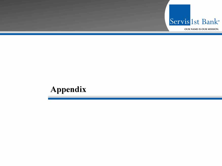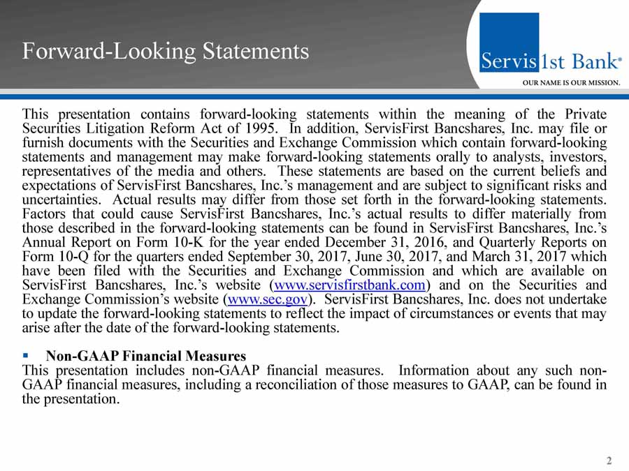 Forward - Looking Statements This presentation contains forward - looking statements within the meaning of the Private Securities Litigation Reform Act of 1995 . In addition, ServisFirst Bancshares, Inc . may file or furnish documents with the Securities and Exchange Commission which contain forward - looking statements and management may make forward - looking statements orally to analysts, investors, representatives of the media and others . These statements are based on the current beliefs and expectations of ServisFirst Bancshares, Inc . ’s management and are subject to significant risks and uncertainties . Actual results may differ from those set forth in the forward - looking statements . Factors that could cause ServisFirst Bancshares, Inc . ’s actual results to differ materially from those described in the forward - looking statements can be found in ServisFirst Bancshares, Inc . ’s Annual Report on Form 10 - K for the year ended December 31 , 2016 , and Quarterly Reports on Form 10 - Q for the quarters ended September 30 , 2017 , June 30 , 2017 , and March 31 , 2017 which have been filed with the Securities and Exchange Commission and which are available on ServisFirst Bancshares, Inc . ’s website ( www . servisfirstbank . com ) and on the Securities and Exchange Commission’s website ( www . sec . gov ) . ServisFirst Bancshares, Inc . does not undertake to update the forward - looking statements to reflect the impact of circumstances or events that may arise after the date of the forward - looking statements . ▪ Non - GAAP Financial Measures This presentation includes non - GAAP financial measures . Information about any such non - GAAP financial measures, including a reconciliation of those measures to GAAP, can be found in the presentation . 2