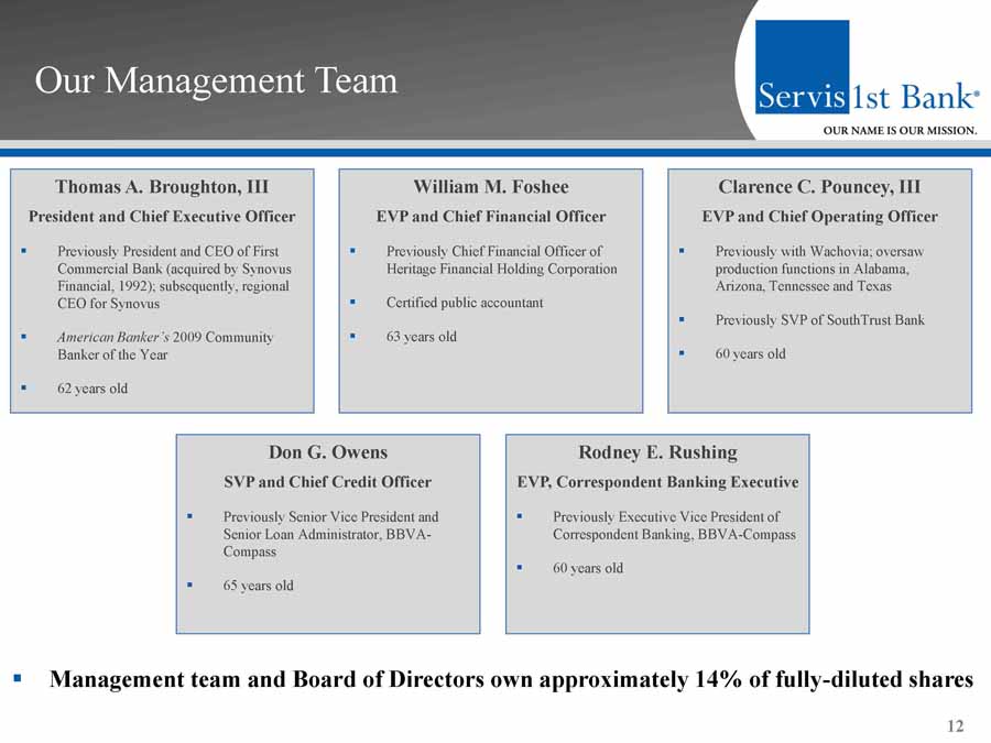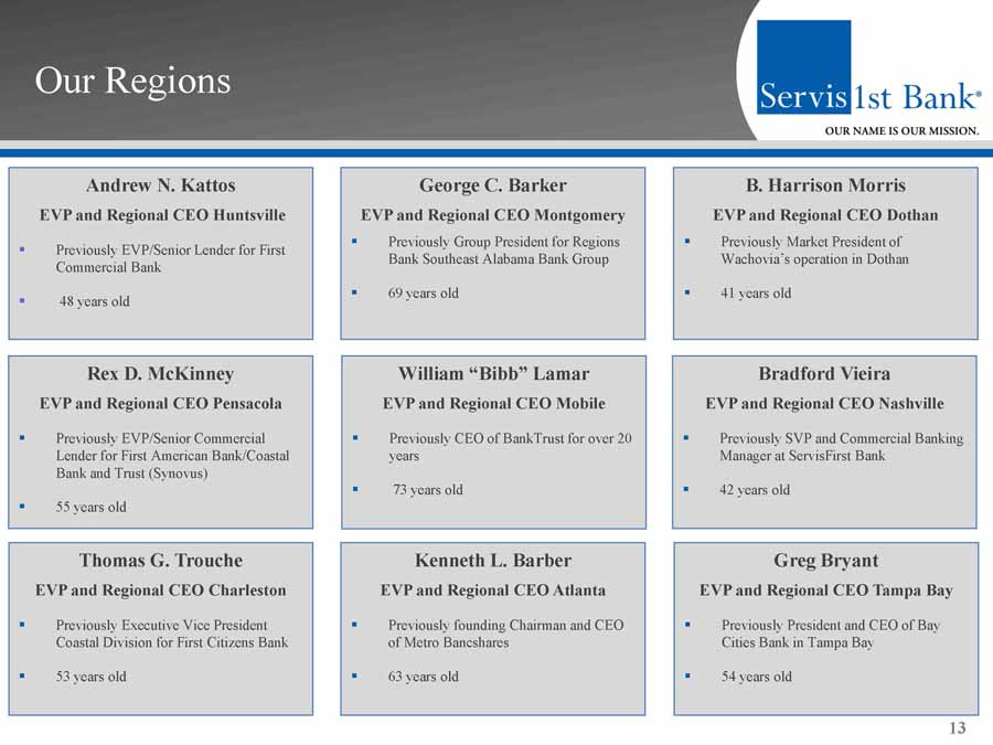 Our Management Team Thomas A. Broughton, III President and Chief Executive Officer ▪ Previously President and CEO of First Commercial Bank (acquired by Synovus Financial, 1992); subsequently, regional CEO for Synovus ▪ American Banker’s 2009 Community Banker of the Year ▪ 62 years old 12 William M. Foshee EVP and Chief Financial Officer ▪ Previously Chief Financial Officer of Heritage Financial Holding Corporation ▪ Certified public accountant ▪ 63 years old Clarence C. Pouncey , III EVP and Chief Operating Officer ▪ Previously with Wachovia; oversaw production functions in Alabama, Arizona, Tennessee and Texas ▪ Previously SVP of SouthTrust Bank ▪ 60 years old Don G. Owens SVP and Chief Credit Officer ▪ Previously Senior Vice President and Senior Loan Administrator, BBVA - Compass ▪ 65 years old Rodney E. Rushing EVP, Correspondent Banking Executive ▪ Previously Executive Vice President of Correspondent Banking, BBVA - Compass ▪ 60 years old ▪ Management team and Board of Directors own approximately 14% of fully - diluted shares
