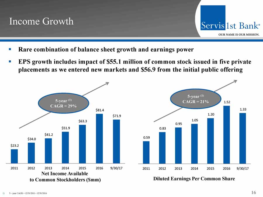 Balance Sheet Growth 15 5 - year (1) CAGR = 22% 5 - year (1) CAGR = 20% Gross Loans ($mm) Total Deposits ($mm) ▪ Organic growth of gross loans and total deposits in the 20% range ▪ 5 - year (1) CAGR of non - interest bearing deposits = 25% ▪ 5 - year (1) CAGR of C&I loans = 20% $1,831 $2,363 $2,859 $3,360 $4,216 $4,912 $5,629 2011 2012 2013 2014 2015 2016 9/30/17 1) 5 – year CAGR = 12/31/2011 – 12/31/2016 $2,144 $2,512 $3,020 $3,398 $4,224 $5,420 $5,797 2011 2012 2013 2014 2015 2016 9/30/17