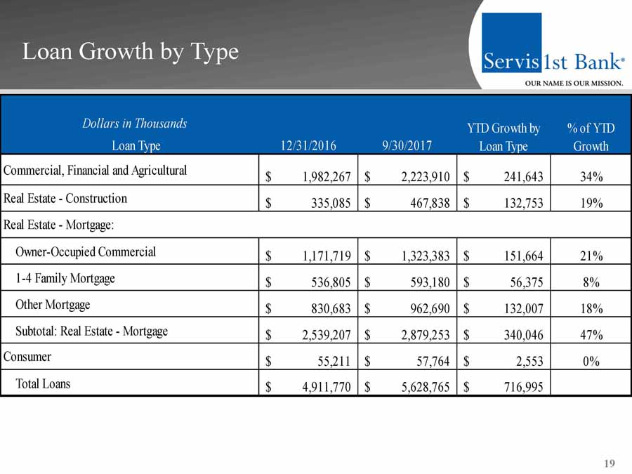 Loan Growth by Region 18 12/31/2016 9/30/2017 YTD Growth 2017 Annualized Growth Rate Birmingham, AL 2,155,907$ 2,419,673$ 263,766$ 16% Dothan, AL 479,623$ 560,748$ 81,125$ 23% Nashville, TN 403,490$ 482,880$ 79,390$ 26% Atlanta, GA 188,597$ 248,827$ 60,230$ 43% Mobile, AL 287,273$ 345,201$ 57,928$ 27% Huntsville, AL 490,926$ 544,322$ 53,396$ 15% Charleston, SC 126,831$ 180,138$ 53,307$ 56% Tampa Bay, FL 68,966$ 109,658$ 40,692$ 79% Montgomery, AL 369,412$ 385,294$ 15,882$ 6% Pensacola, FL 340,745$ 352,024$ 11,279$ 4% Total Loans 4,911,770$ 5,628,765$ 716,995$ 20% Dollars in Thousands Region