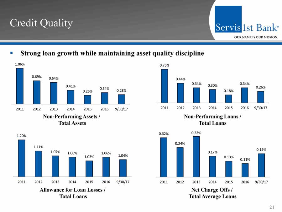 Credit Trends 20 (In Thousands) 2011 2012 2013 2014 2015 2016 9/30/2017 1-4 Family Construction Speculative 30,301$ 24,962$ 16,403$ 13,608$ 25,794$ 27,835$ 33,656$ 1-4 Family Construction Sold 11,159$ 21,607$ 21,414$ 28,124$ 29,086$ 45,051$ 40,779$ Resi Acquisition & Development 31,400$ 20,949$ 20,474$ 20,009$ 18,693$ 17,681$ 34,423$ Multifamily Permanent 28,481$ 39,800$ 38,601$ 54,725$ 71,217$ 92,052$ 110,766$ Residential Lot Loans 30,115$ 25,160$ 20,418$ 25,630$ 27,844$ 23,138$ 20,174$ Commercial Lots 10,067$ 10,054$ 9,479$ 16,007$ 17,986$ 25,618$ 33,196$ Raw Land 24,961$ 27,063$ 24,686$ 30,124$ 60,360$ 37,228$ 38,553$ Commercial Construction 14,801$ 26,565$ 50,389$ 76,904$ 72,807$ 158,537$ 267,057$ Other CRE Income Property 160,080$ 219,873$ 273,806$ 341,262$ 517,416$ 640,793$ 730,070$ Total CRE (Excluding O/O CRE) 341,365$ 416,034$ 475,671$ 606,394$ 841,203$ 1,067,930$ 1,308,674$ Total Risk-Based Capital 246,334$ 287,136$ 343,904$ 458,073$ 530,688$ 616,415$ 688,432$ CRE as % of Total Capital 139% 145% 138% 132% 159% 173% 190% Total Gross Loans 1,830,742$ 2,363,182$ 2,858,868$ 3,359,858$ 4,216,375$ 4,911,770$ 5,628,765$ CRE as % of Total Portfolio 19% 18% 17% 18% 20% 22% 23% CRE Owner Occupied 398,601$ 568,041$ 710,372$ 793,917$ 1,014,669$ 1,171,719$ 1,323,383$ CRE OO as % of Total Portfolio 22% 24% 25% 24% 24% 24% 24% CRE OO as % of Total Capital 162% 198% 207% 173% 191% 190% 192% AD&C 151,218$ 158,361$ 151,868$ 208,769$ 243,267$ 335,085$ 467,838$ AD&C as % of Total Capital 61% 55% 44% 46% 46% 54% 68% AD&C as % of Total Portfolio 8% 7% 5% 6% 6% 7% 8% Year Ended December 31, Commercial Real Estate Trends Acquisition, Development, & Construction Trends