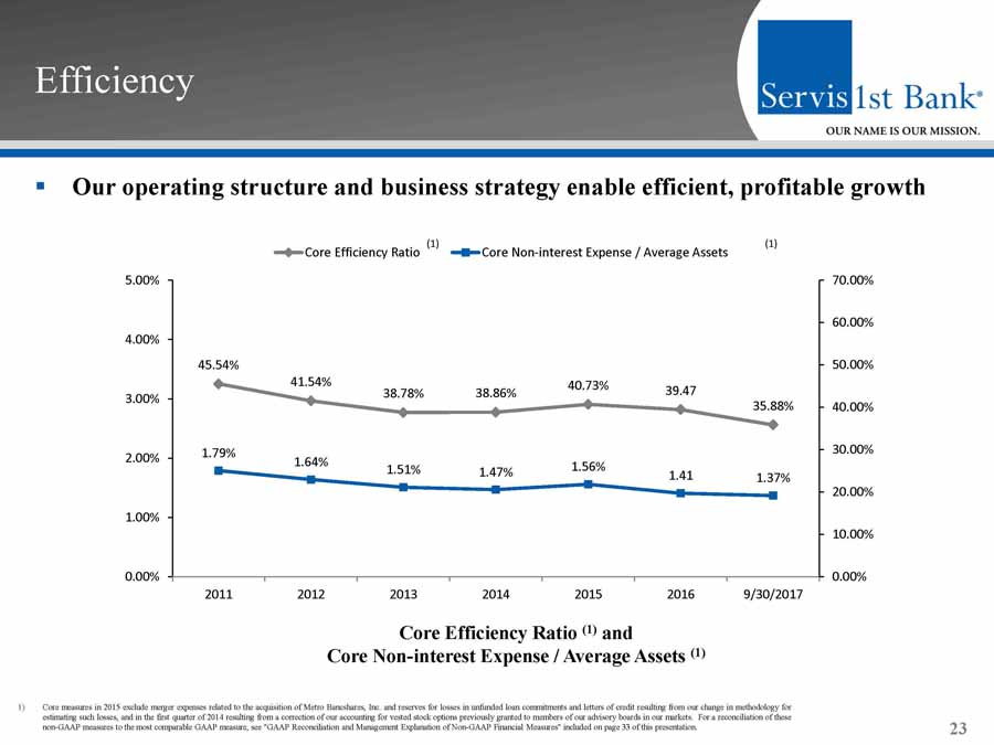▪ Consistent earnings results and strong momentum Profitability Metrics 22 Core Return on Average Assets (1) Core Return on Average Equity (1) Core Return on Average Common Equity (1) Net Interest Margin 1) Core measures in 2015 exclude merger expenses related to the acquisition of Metro Bancshares, Inc. and reserves for losses in un funded loan commitments and letters of credit resulting from our change in methodology for estimating such losses, and in the first quarter of 2014 resulting from a correction of our accounting for vested stock optio ns previously granted to members of our advisory boards in our markets. For a reconciliation of these non - GAAP measures to the most comparable GAAP measure, see "GAAP Reconciliation and Management Explanation of Non - GAAP Financial Mea sures" included on page 33 of this presentation. 1.11% 1.30% 1.31% 1.44% 1.42% 1.42% 1.52% 2011 2012 2013 2014 2015 2016 9/30/17 17.01% 19.41% 18.30% 16.74% 15.73% 16.63% 17.24% 2011 2012 2013 2014 2015 2016 9/30/17 3.79% 3.80% 3.80% 3.68% 3.75% 3.42% 3.69% 2011 2012 2013 2014 2015 2016 9/30/17 14.73% 15.81% 15.54% 15.00% 14.96% 16.64% 17.25% 2011 2012 2013 2014 2015 2016 9/30/17
