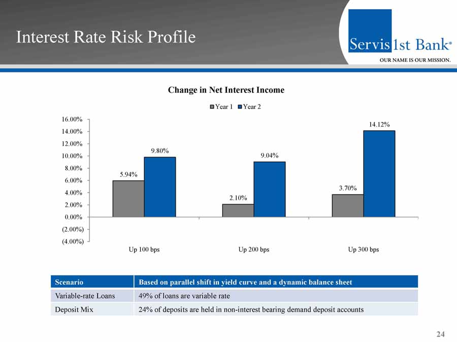 ▪ Our operating structure and business strategy enable efficient, profitable growth Efficiency 23 Core Efficiency Ratio (1) and Core Non - interest Expense / Average Assets (1) (1) (1) 45.54% 41.54% 38.78% 38.86% 40.73% 39.47 35.88% 1.79% 1.64% 1.51% 1.47% 1.56% 1.41 1.37% 0.00% 1.00% 2.00% 3.00% 4.00% 5.00% 2011 2012 2013 2014 2015 2016 9/30/2017 0.00% 10.00% 20.00% 30.00% 40.00% 50.00% 60.00% 70.00% Core Efficiency Ratio Core Non-interest Expense / Average Assets 1) Core measures in 2015 exclude merger expenses related to the acquisition of Metro Bancshares, Inc . and reserves for losses in unfunded loan commitments and letters of credit resulting from our change in methodology for estimating such losses, and in the first quarter of 2014 resulting from a correction of our accounting for vested stock options previously granted to members of our advisory boards in our markets . For a reconciliation of these non - GAAP measures to the most comparable GAAP measure, see "GAAP Reconciliation and Management Explanation of Non - GAAP Financial Measures" included on page 33 of this presentation .
