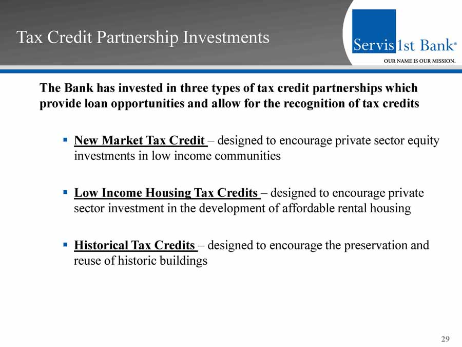 Tax Credit Partnership Investments The Bank has invested in three types of tax credit partnerships which provide loan opportunities and allow for the recognition of tax credits ▪ New Market Tax Credit – designed to encourage private sector equity investments in low income communities ▪ Low Income Housing Tax Credits – designed to encourage private sector investment in the development of affordable rental housing ▪ Historical Tax Credits – designed to encourage the preservation and reuse of historic buildings 29