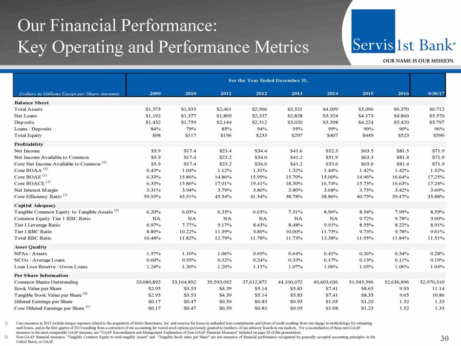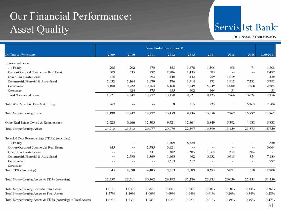 Our Financial Performance: Key Operating and Performance Metrics 30 2009 2010 2011 2012 2013 2014 2015 2016 9/30/17 Balance Sheet Total Assets $1,573 $1,935 $2,461 $2,906 $3,521 $4.099 $5.096 $6.370 $6.712 Net Loans $1,192 $1,377 $1,809 $2,337 $2,828 $3.324 $4.173 $4.860 $5.570 Deposits $1,432 $1,759 $2,144 $2,512 $3,020 $3.398 $4.224 $5.420 $5.797 Loans / Deposits 84% 79% 85% 94% 95% 99% 99% 90% 96% Total Equity $98 $117 $196 $233 $297 $407 $449 $523 $590 Profitability Net Income $5.9 $17.4 $23.4 $34.4 $41.6 $52.3 $63.5 $81.5 $71.9 Net Income Available to Common $5.9 $17.4 $23.2 $34.0 $41.2 $51.9 $63.3 $81.4 $71.9 Core Net Income Available to Common (1) $5.9 $17.4 $23.2 $34.0 $41.2 $53.6 $65.0 $81.4 $71.9 Core ROAA (1) 0.43% 1.04% 1.12% 1.31% 1.32% 1.44% 1.42% 1.42% 1.52% Core ROAE (1) 6.33% 15.86% 14.86% 15.99% 15.70% 15.00% 14.96% 16.64% 17.25% Core ROACE (1) 6.33% 15.86% 17.01% 19.41% 18.30% 16.74% 15.73% 16.63% 17.24% Net Interest Margin 3.31% 3.94% 3.79% 3.80% 3.80% 3.68% 3.75% 3.42% 3.69% Core Efficiency Ratio (1) 59.93% 45.51% 45.54% 41.54% 38.78% 38.86% 40.73% 39.47% 35.88% Capital Adequacy Tangible Common Equity to Tangible Assets (2) 6.20% 6.05% 6.35% 6.65% 7.31% 8.96% 8.54% 7.99% 8.59% Common Equity Tier 1 RBC Ratio NA NA NA NA NA NA 9.72% 9.78% 9.60% Tier I Leverage Ratio 6.97% 7.77% 9.17% 8.43% 8.48% 9.91% 8.55% 8.22% 8.91% Tier I RBC Ratio 8.89% 10.22% 11.39% 9.89% 10.00% 11.75% 9.73% 9.78% 9.61% Total RBC Ratio 10.48% 11.82% 12.79% 11.78% 11.73% 13.38% 11.95% 11.84% 11.51% Asset Quality NPAs / Assets 1.57% 1.10% 1.06% 0.69% 0.64% 0.41% 0.26% 0.34% 0.28% NCOs / Average Loans 0.60% 0.55% 0.32% 0.24% 0.33% 0.17% 0.13% 0.11% 0.19% Loan Loss Reserve / Gross Loans 1.24% 1.30% 1.20% 1.11% 1.07% 1.06% 1.03% 1.06% 1.04% Per Share Information Common Shares Outstanding 33,080,892 33,164,892 35,593,092 37,612,872 44,100,072 49,603,036 51,945,396 52,636,896 52,970,310 Book Value per Share $2.95 $3.53 $4.39 $5.14 $5.83 $7.41 $8.65 9.93 11.14 Tangible Book Value per Share (2) $2.95 $3.53 $4.39 $5.14 $5.83 $7.41 $8.35 9.65 10.86 Diluted Earnings per Share $0.17 $0.47 $0.59 $0.83 $0.95 $1.05 $1.20 1.52 1.33 Core Diluted Earnings per Share (1) $0.17 $0.47 $0.59 $0.83 $0.95 $1.08 $1.23 1.52 1.33 For the Year Ended December 31, Dollars in Millions Except per Share Amounts 1) Core measures in 2015 exclude merger expenses related to the acquisition of Metro Bancshares, Inc. and reserves for losses in un funded loan commitments and letters of credit resulting from our change in methodology for estimating such losses, and in the first quarter of 2014 resulting from a correction of our accounting for vested stock options previous ly granted to members of our advisory boards in our markets. For a reconciliation of these non - GAAP measures to the most comparable GAAP measure, see "GAAP Reconciliation and Management Explanation of Non - GAAP Financial Measures " included on page 33 of this presentation. 2) Non - GAAP financial measures . "Tangible Common Equity to total tangible Assets" and "Tangible Book value per Share" are not measures of financial performance recognized by generally accepted accounting principles in the United States, or GAAP .