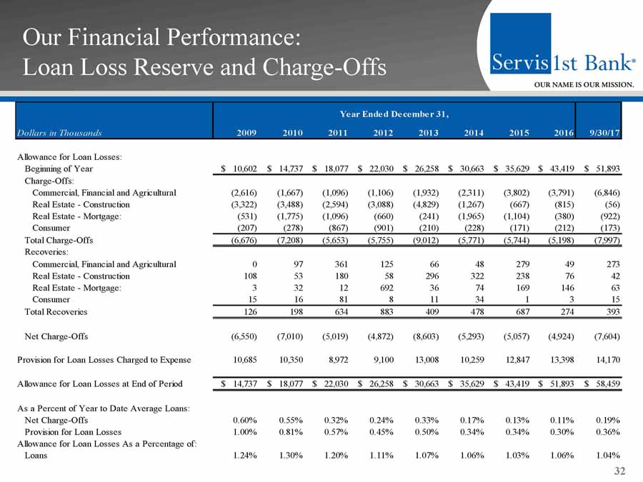 Our Financial Performance: Asset Quality 31 Dollars in Thousands 2009 2010 2011 2012 2013 2014 2015 2016 9/30/2017 Nonaccrual Loans: 1-4 Family 265 202 670 453 1,878 1,596 198 74 1,308 Owner-Occupied Commercial Real Estate 909 635 792 2,786 1,435 683 -- -- 2,497 Other Real Estate Loans 615 -- 693 240 243 959 1,619 -- 430 Commercial, Financial & Agricultural 2,032 2,164 1,179 276 1,714 172 1,918 7,282 5,798 Construction 8,100 10,722 10,063 6,460 3,749 5,049 4,000 3,268 2,285 Consumer -- 624 375 135 602 666 31 -- 38 Total Nonaccrual Loans 11,921 14,347 13,772 10,350 9,621 9,125 7,766 10,624 12,356 Total 90+ Days Past Due & Accruing 267 -- -- 8 115 925 1 6,263 2,506 Total Nonperforming Loans 12,188 14,347 13,772 10,358 9,736 10,050 7,767 16,887 14,862 Other Real Estate Owned & Repossessions 12,525 6,966 12,305 9,721 12,861 6,840 5,392 4,988 3,888 Total Nonperforming Assets 24,713 21,313 26,077 20,079 22,597 16,890 13,159 21,875 18,750 Troubled Debt Restructurings (TDRs) (Accruing): 1-4 Family -- -- -- 1,709 8,225 -- -- -- 850 Owner-Occupied Commercial Real Estate 845 -- 2,785 3,121 -- -- -- -- 3,664 Other Real Estate Loans -- -- 331 302 285 1,663 253 204 -- Commercial, Financial & Agricultural -- 2,398 1,369 1,168 962 6,632 6,618 354 7,189 Construction -- -- -- 3,213 217 -- -- -- 997 Consumer -- -- -- -- -- -- -- -- -- Total TDRs (Accruing) 845 2,398 4,485 9,513 9,689 8,295 6,871 558 12,700 Total Nonperforming Assets & TDRs (Accruing) 25,558 23,711 30,562 29,592 32,286 25,185 20,030 22,433 31,450 Total Nonperforming Loans to Total Loans 1.01% 1.03% 0.75% 0.44% 0.34% 0.30% 0.18% 0.34% 0.26% Total Nonperforming Assets to Total Assets 1.57% 1.10% 1.06% 0.69% 0.64% 0.41% 0.26% 0.34% 0.28% Total Nonperforming Assets & TDRs (Accruing) to Total Assets 1.62% 1.23% 1.24% 1.02% 0.92% 0.61% 0.39% 0.35% 0.47% Year Ended December 31,