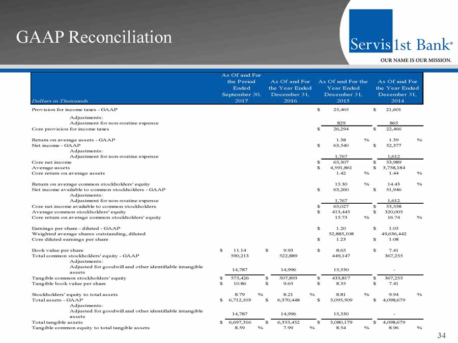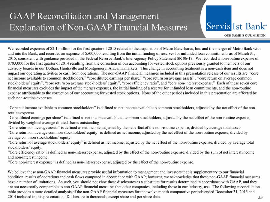 GAAP Reconciliation and Management Explanation of Non - GAAP Financial Measures 33 We recorded expenses of $2.1 million for the first quarter of 2015 related to the acquisition of Metro Bancshares, Inc. and t he merger of Metro Bank with and into the Bank, and recorded an expense of $500,000 resulting from the initial funding of reserves for unfunded loan commi tme nts as of March 31, 2015, consistent with guidance provided in the Federal Reserve Bank’s Inter - agency Policy Statement SR 06 - 17. We recorded a non - routine expense of $703,000 for the first quarter of 2014 resulting from the correction of our accounting for vested stock options previously gr ant ed to members of our advisory boards in our Dothan, Huntsville and Montgomery, Alabama markets. This change in accounting treatment is a non - cash it em and does not impact our operating activities or cash from operations. The non - GAAP financial measures included in this presentation release of our results are “core net income available to common stockholders,” “core diluted earnings per share,” “core return on average assets” , “core retu rn on average common stockholders’ equity”, “core return on average stockholders’ equity”, “core efficiency ratio”, and “core non - interest expense.” Each of these seven core financial measures excludes the impact of the merger expenses, the initial funding of a reserve for unfunded loan commitments , a nd the non - routine expense attributable to the correction of our accounting for vested stock options. None of the other periods included in thi s p resentation are affected by such non - routine expenses. “Core net income available to common stockholders” is defined as net income available to common stockholders, adjusted by the ne t effect of the non - routine expense. “Core diluted earnings per share” is defined as net income available to common stockholders, adjusted by the net effect of th e n on - routine expense, divided by weighted average diluted shares outstanding. “Core return on average assets” is defined as net income, adjusted by the net effect of the non - routine expense, divided by aver age total assets. “Core return on average common stockholders’ equity” is defined as net income, adjusted by the net effect of the non - routine exp ense, divided by average common stockholders’ equity. “Core return of average stockholders’ equity” is defined as net income, adjusted by the net effect of the non - routine expense, d ivided by average total stockholders’ equity. “Core efficiency ratio” is defined as non - interest expense, adjusted by the effect of the non - routine expense, divided by the su m of net interest income and non - interest income. “Core non - interest expense” is defined as non - interest expense, adjusted by the effect of the non - routine expense. We believe these non - GAAP financial measures provide useful information to management and investors that is supplementary to our financial condition, results of operations and cash flows computed in accordance with GAAP; however, we acknowledge that these non - GAAP fi nancial measures have a number of limitations. As such, you should not view these disclosures as a substitute for results determined in accor dan ce with GAAP, and they are not necessarily comparable to non - GAAP financial measures that other companies, including those in our industry, use. The f ollowing reconciliation table provides a more detailed analysis of the non - GAAP financial measures for the twelve month comparative periods ended Decemb er 31, 2015 and 2014 included in this presentation. Dollars are in thousands, except share and per share data.