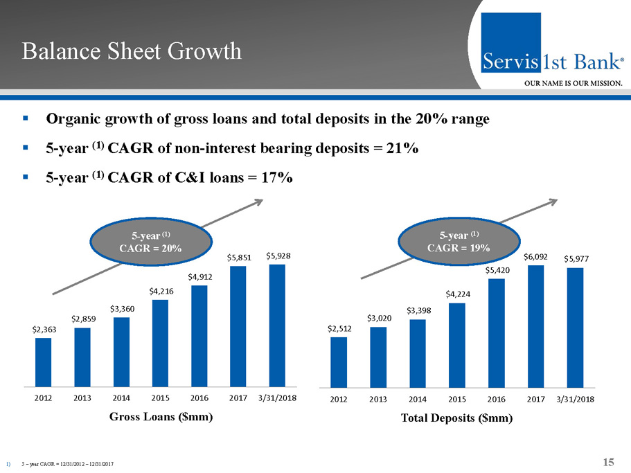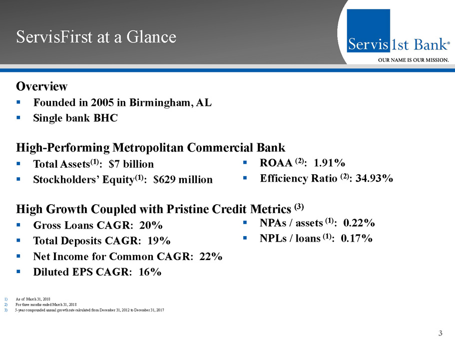 Forward - Looking Statements This presentation contains forward - looking statements within the meaning of the Private Securities Litigation Reform Act of 1995 . In addition, ServisFirst Bancshares, Inc . may file or furnish documents with the Securities and Exchange Commission which contain forward - looking statements and management may make forward - looking statements orally to analysts, investors, representatives of the media and others . These statements are based on the current beliefs and expectations of ServisFirst Bancshares, Inc . ’s management and are subject to significant risks and uncertainties . Actual results may differ from those set forth in the forward - looking statements . Factors that could cause ServisFirst Bancshares, Inc . ’s actual results to differ materially from those described in the forward - looking statements can be found in ServisFirst Bancshares, Inc . ’s Annual Report on Form 10 - K for the year ended December 31 , 2017 , and Quarterly Reports on Form 10 - Q for the quarters ended March 31 , 2018 , September 30 , 2017 , and June 30 , 2017 which have been filed with the Securities and Exchange Commission and which are available on ServisFirst Bancshares, Inc . ’s website ( www . servisfirstbank . com ) and on the Securities and Exchange Commission’s website ( www . sec . gov ) . ServisFirst Bancshares, Inc . does not undertake to update the forward - looking statements to reflect the impact of circumstances or events that may arise after the date of the forward - looking statements . ▪ Non - GAAP Financial Measures This presentation includes non - GAAP financial measures . Information about any such non - GAAP financial measures, including a reconciliation of those measures to GAAP, can be found in the presentation . 2