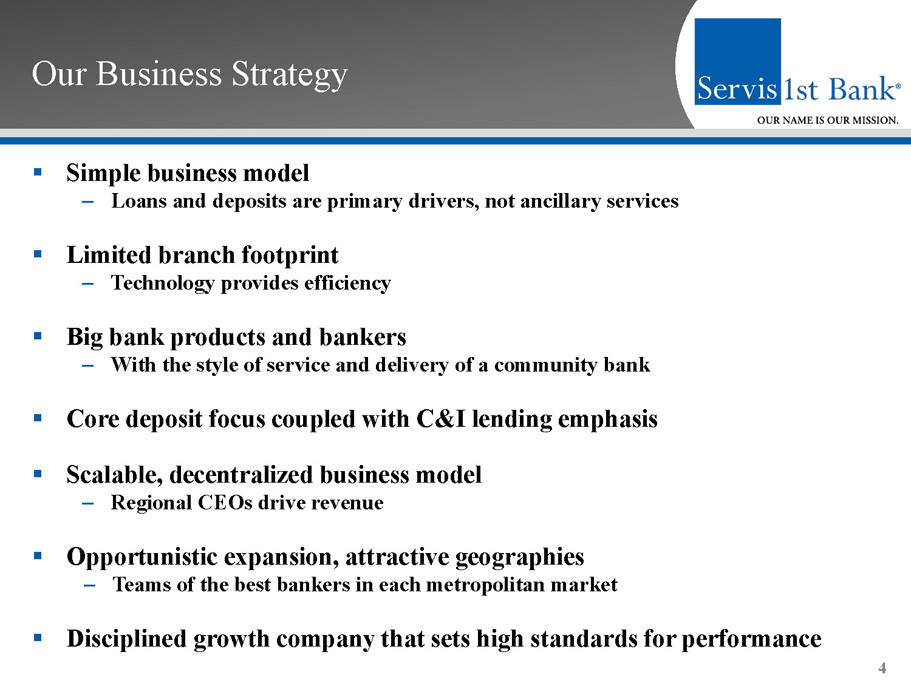 ServisFirst at a Glance Overview ▪ Founded in 2005 in Birmingham, AL ▪ Single bank BHC High - Performing Metropolitan Commercial Bank ▪ Total Assets (1) : $7 billion ▪ Stockholders’ Equity (1) : $629 million High Growth Coupled with Pristine Credit Metrics (3) ▪ Gross Loans CAGR: 20% ▪ Total Deposits CAGR: 19% ▪ Net Income for Common CAGR: 22% ▪ Diluted EPS CAGR: 16% 3 ▪ ROAA (2) : 1.91% ▪ Efficiency Ratio (2) : 34.93% 1) As of March 31, 2018 2) For three months ended March 31, 2018 3) 5 - year compounded annual growth rate calculated from December 31, 2012 to December 31, 2017 ▪ NPAs / assets (1) : 0.22% ▪ NPLs / loans (1) : 0.17%