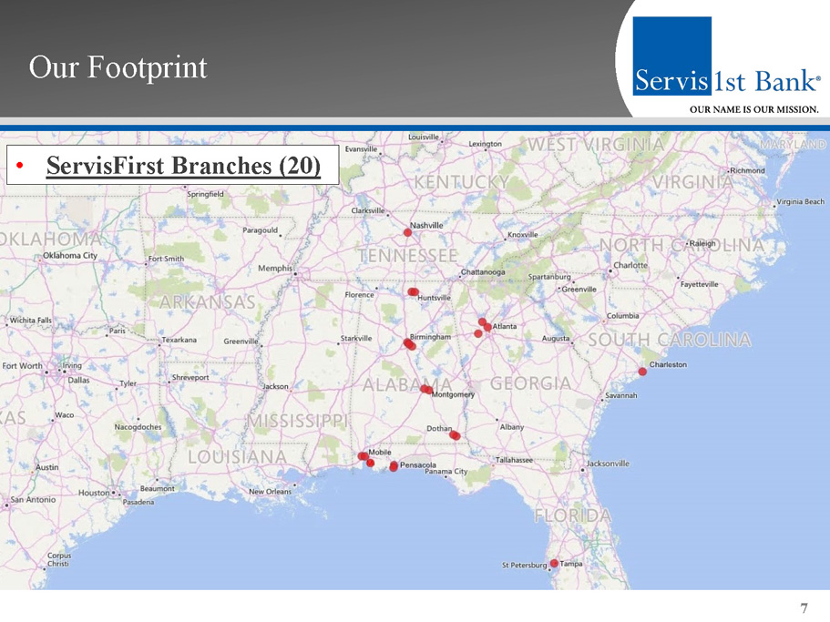 Milestones 6 ▪ Founded in May 2005 with initial capital raise of $35 million ▪ Reached profitability during the fourth quarter of 2005 and have been profitable every quarter since ▪ Achieved total asset milestones of $1 billion in 2008, $2 billion in 2011, $3 billion in 2013, $4 billion in 2014, $5 billion in 2015, $6 billion in 2016, and $7 billion in 2017 2014 May ’05: Founded in Birmingham, AL June ’07: Montgomery, AL March ’11: Correspondent Banking April ’13: Mobile, AL May ’14: NASDAQ listed August ’06: Huntsville, AL September ’08: Dothan, AL April ’11: Pensacola, FL April ’13: Nashville, TN February ‘15: Metro Bank Acquisition January ’15: Charleston, SC 2015 2012 2013 2011 2010 2009 2008 2007 2006 2005 January ’16: Tampa Bay, FL 2017 2016 2018