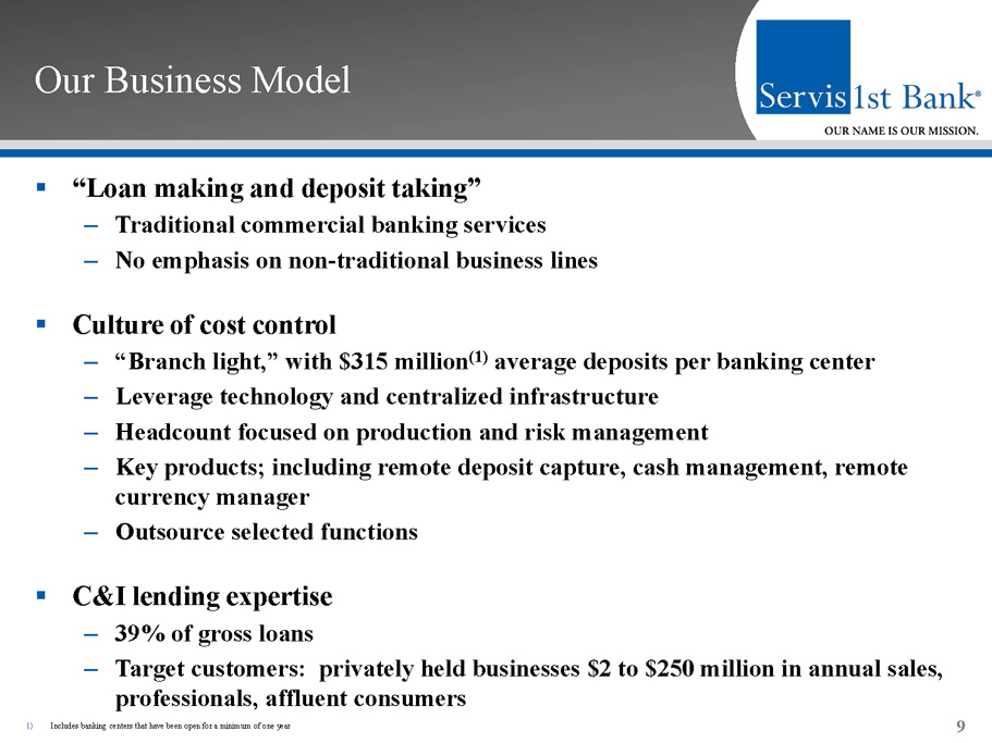 Our Regions 8 1) Represents metropolitan statistical areas (MSAs) 2) As of May 2018 3) As reported by the FDIC as of 6/30/2017 Total Branches (2) Total MSA Deposits (3) ($ in billions) Market Share (3) (%) 3 37.9 6.2 2 8.1 6.8 2 7.8 9.7 3 7.2 3.3 2 3.2 15.1 1 81.9 0.1 2 5.6 5.9 1 57.4 0.5 Atlanta - Sandy Springs - Roswell 3 166.9 0.2 Charleston 1 13.2 0.8 20 389.2Total Nashville Montgomery Dothan Mobile Florida Tampa - St. Petersburg - Clearwater Region (1) Alabama Georgia South Carolina Birmingham - Hoover Huntsville Pensacola - Ferry Pass - Brent Tennessee
